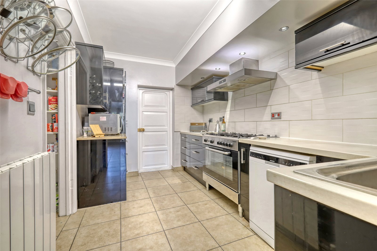 Fitted with a range of contemporary units and rolled edge work surfaces with inset stainless steel sink unit with dish rinse, cupboards and drawers below. Space and plumbing for dishwasher. Space for Range cooker with stainless steel extractor hood above. Wall mounted storage cabinets. Tiled floor. Radiator. Coved ceiling. Further walk in larder cupboard. Part tiled walls. Door to garage.