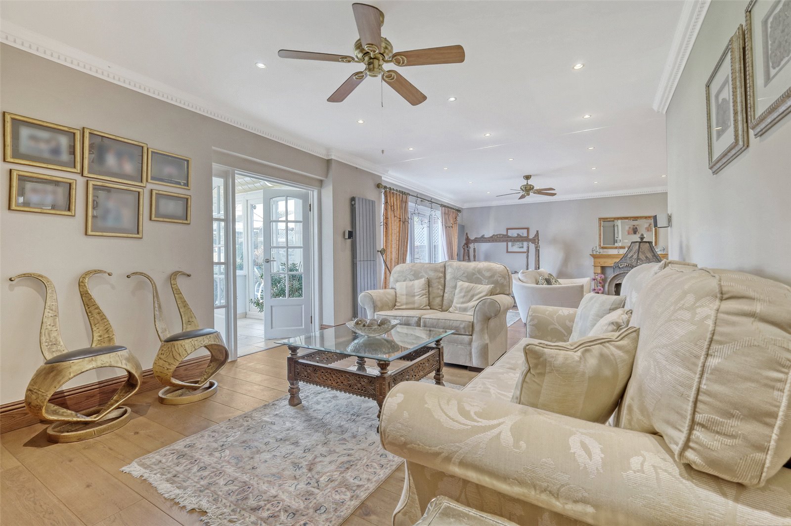 Overall size. This fabulous and versatile “L” shape living room has wide double glazed French double doors and side screens framing lovely views across the rear garden. Wood floor. Two designer radiators. Cast iron fireplace with coal effect gas fire, timber surround and granite hearth. Ornate coved ceiling with recessed lighting. Four designer radiators. Glazed double doors leading to: