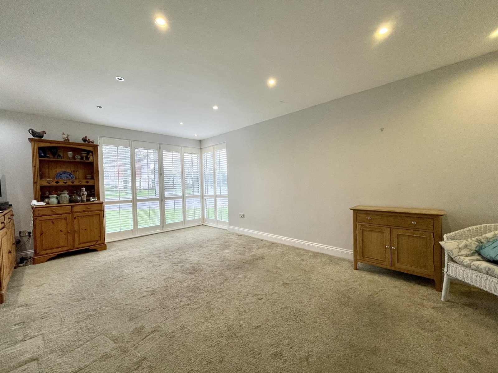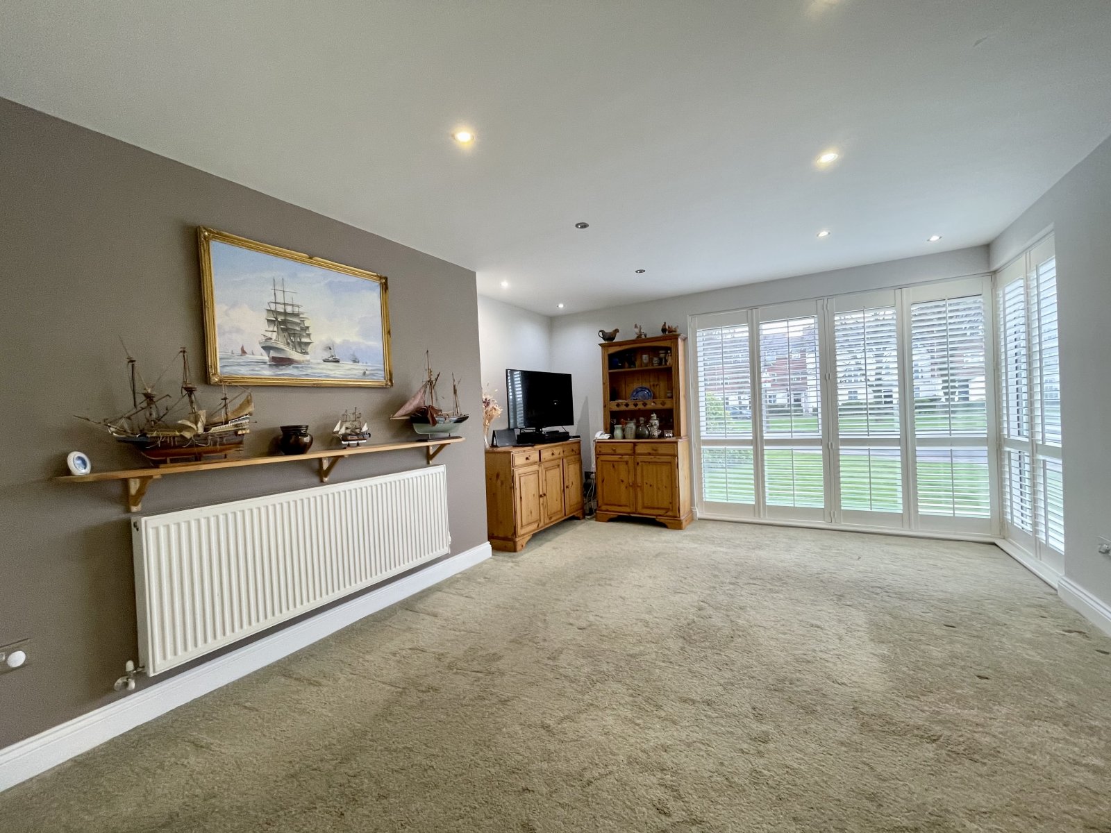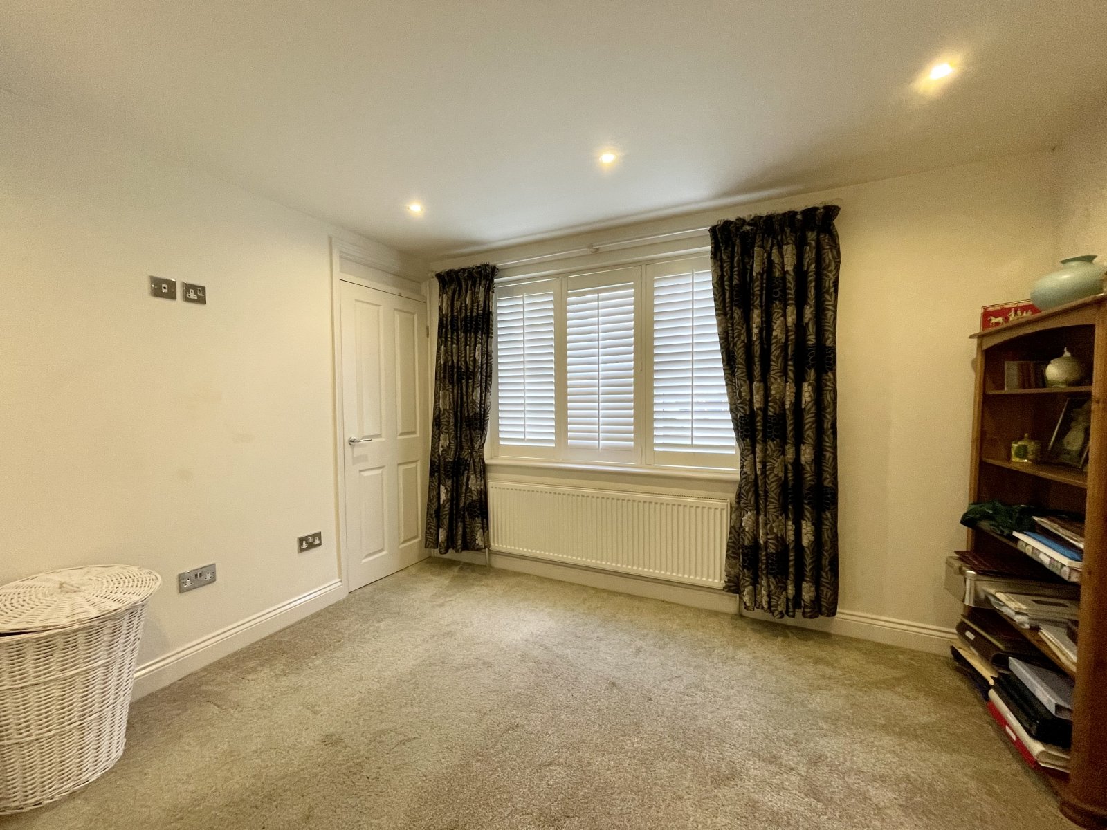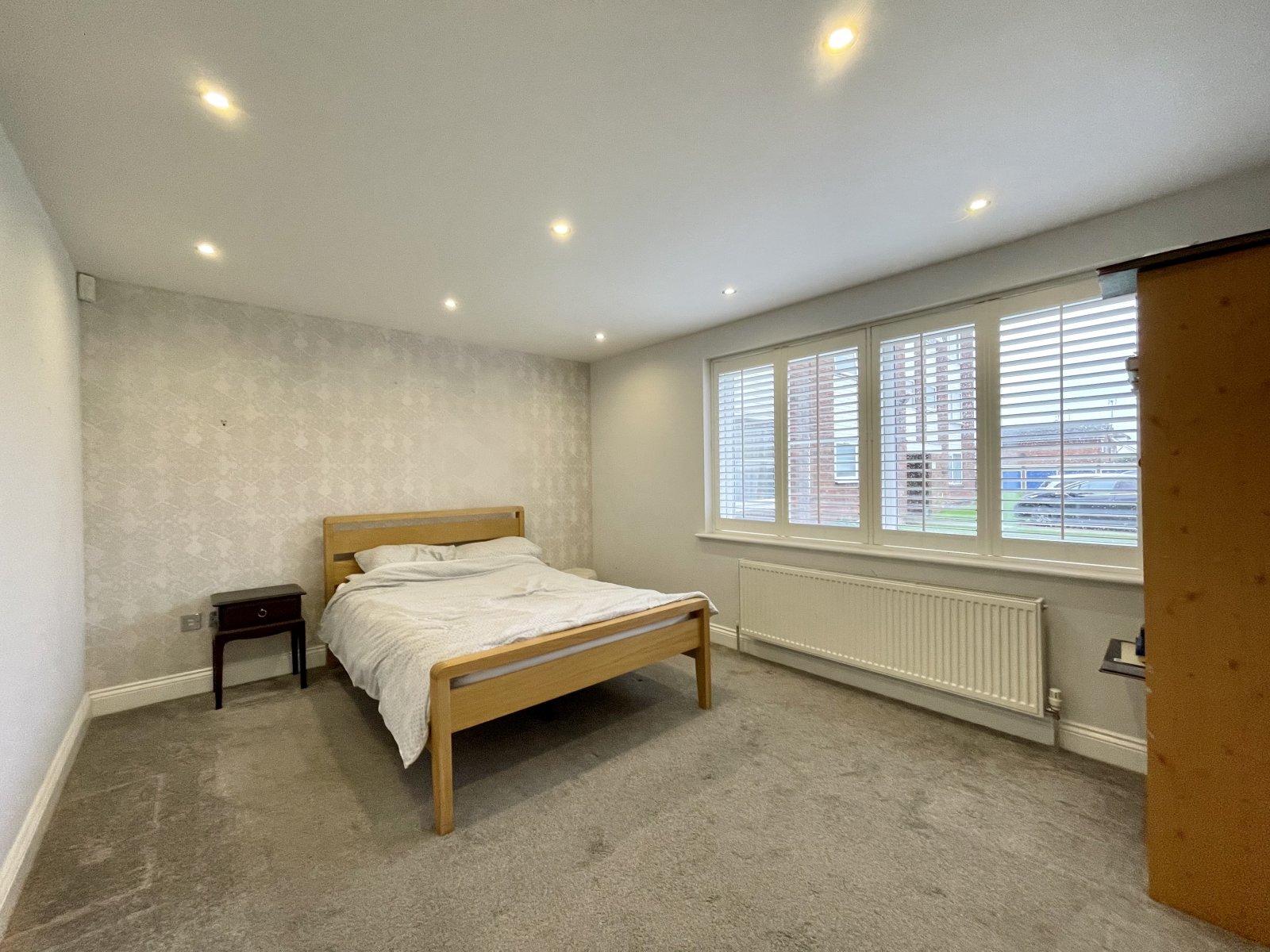 Large full height UPVC double glazed corner window with fitted wooden shutters. Wall mounted radiator. High level skirting. Smooth plastered ceilings with recessed LED lighting.