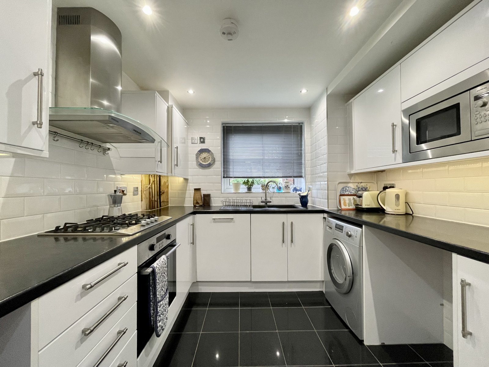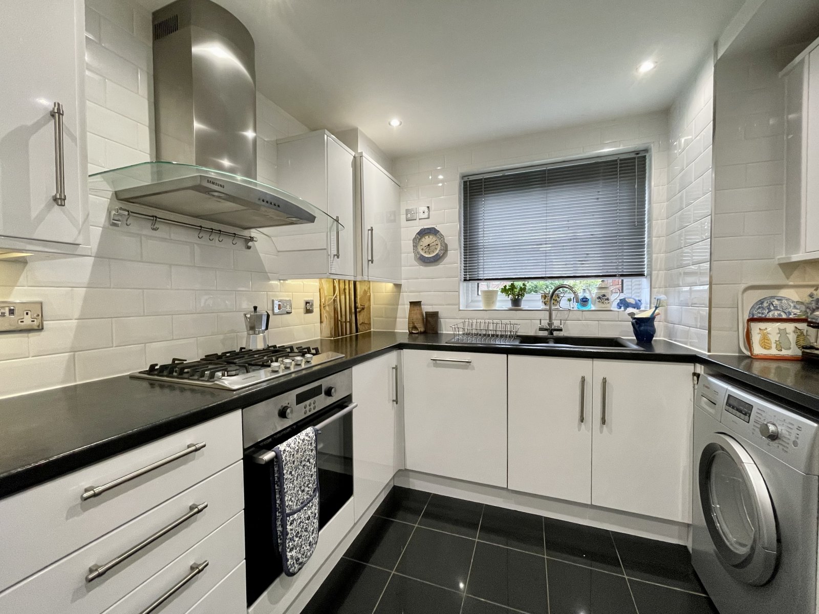 UPVC double glazed window to front. Kitchen is fitted with a modern range of high gloss base and eye level units incorporating a rolled edge working surface. Inset one and a half bowl composite sink with mixer tap and drainer unit. Inset four burner gas hob with canopied extractor hood above. Integrated fan assist electric oven. Integrated microwave oven and slim line dishwasher. Space and plumbing for washing machine. Space for free standing fridge/freezer. Cupboard housing gas fired boiler. Wall mounted radiator. Fully tiled walls. Smooth plastered ceilings with recessed LED lighting.