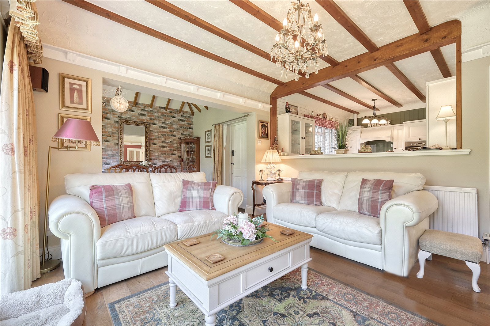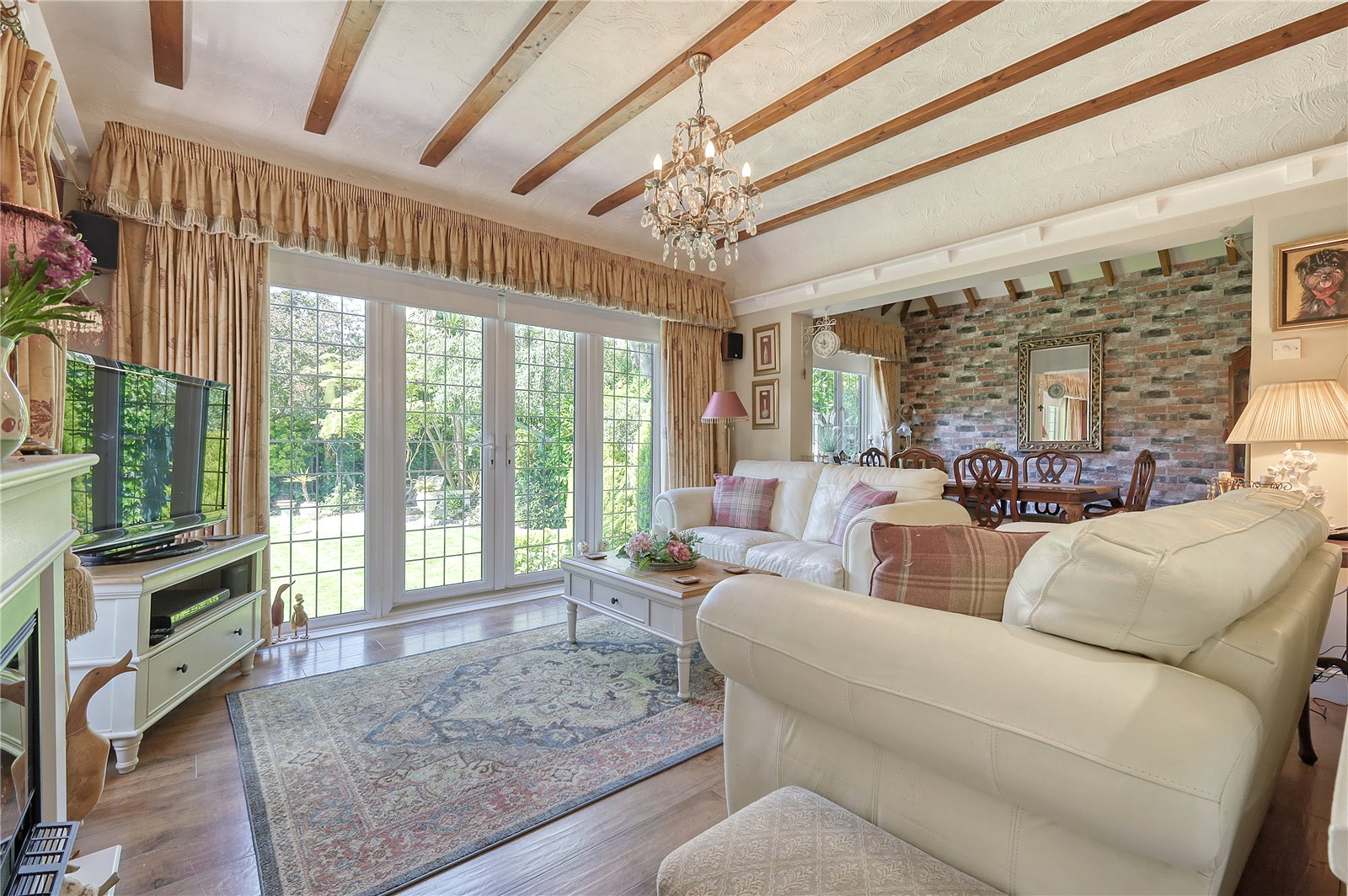 This bright and spacious living room enjoys a dual aspect with double glazed French double doors leading to the side Loggia and garden. Further wide double glazed French double doors and side screens framing lovely views across the rear garden. Attractive Oak wood flooring. Beamed ceiling. Delft shelf. Radiator. Feature fireplace. Wide opening to kitchen. Wide opening to: