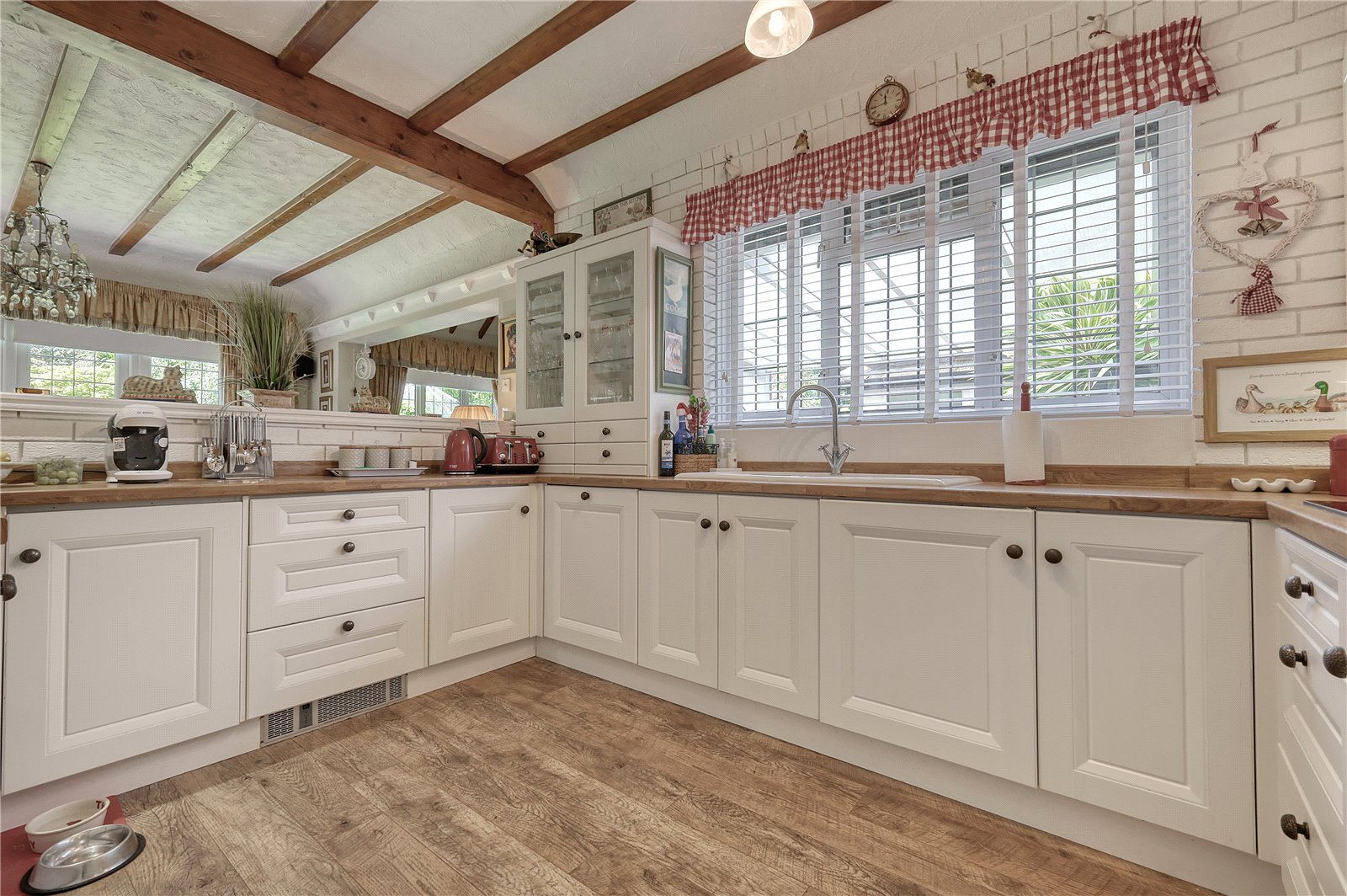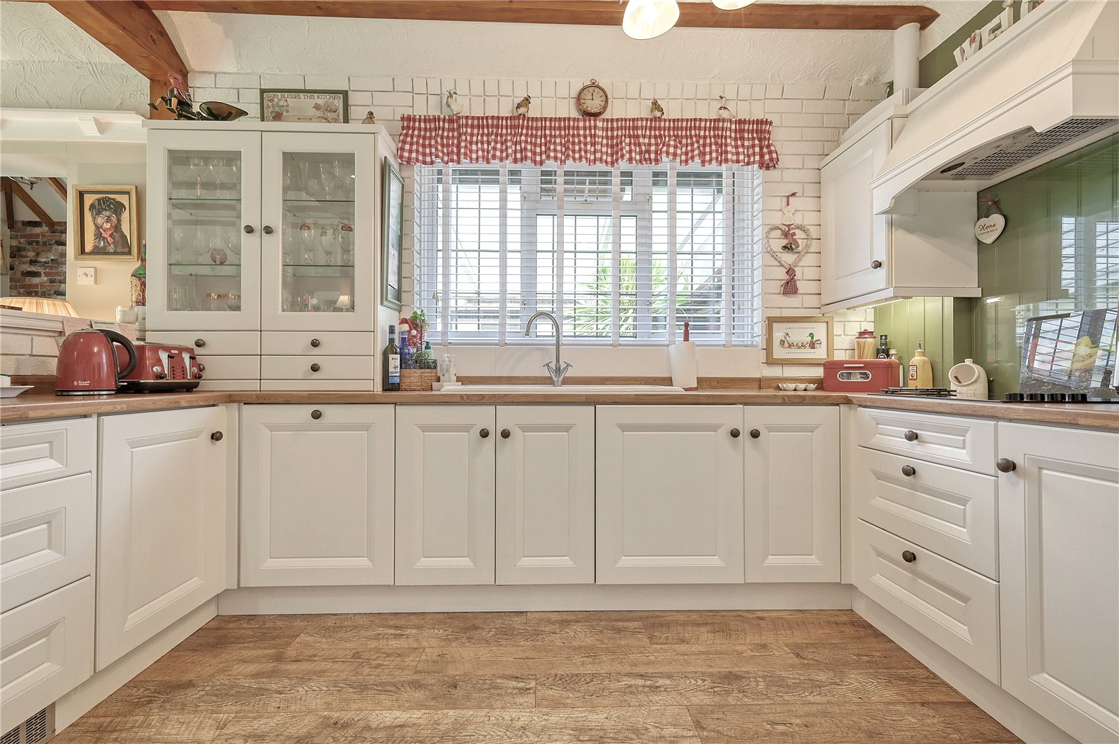 Fitted with an extensive range of modern white fronted units and extensive wood effect rolled edge work surfaces with inset Porcelain sink with mixer tap. Range of cupboards and drawers below. Built in dishwasher with matching decor panel. Built in washing machine with matching decor panel. Inset four ring ceramic hob with concealed extractor hood above. Saucepan drawers below. Oven housing with built in double oven, cupboards above and below. Built in refrigerator with matching decor panel, cupboard below. Wall mounted storage cabinets and China display cabinets. Concealed Vaillant gas fired central heating boiler. Feature exposed brick walls plus Tongue & Groove wood panelling. Beamed ceiling. Double glazed window to side. Wood floor.