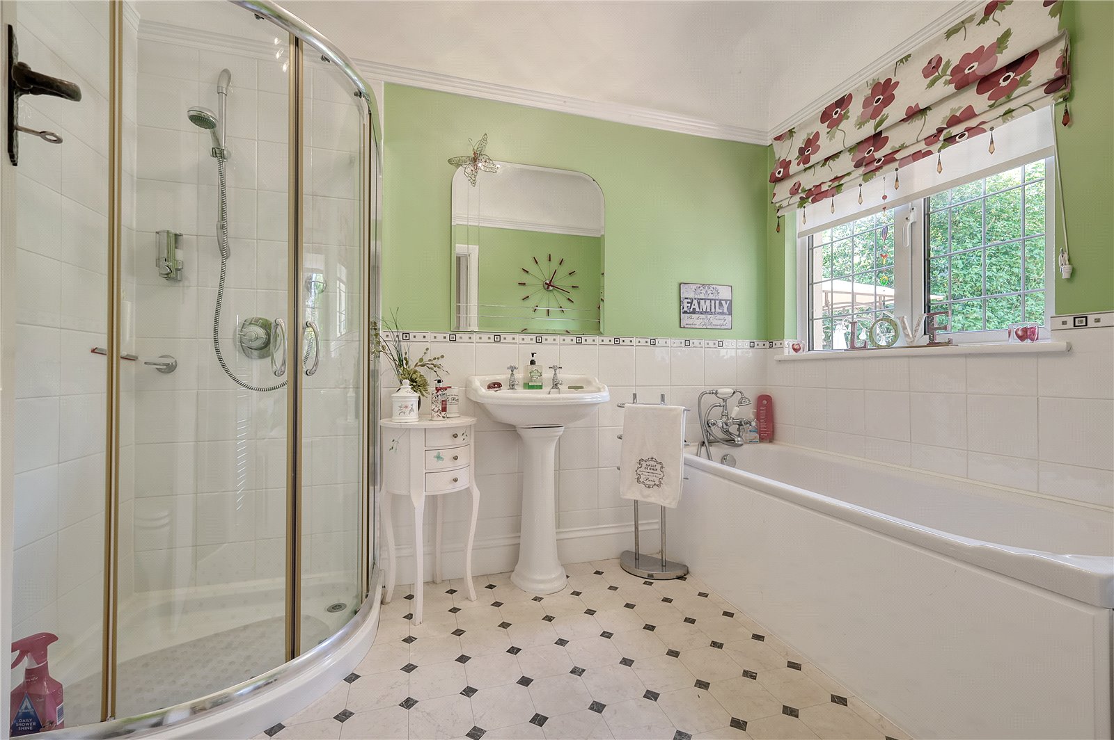 A good size bathroom fitted with white suite comprising panelled bath with mixer tap and shower attachment. Separate fully tiled Quadrant shower cubicle. Pedestal wash basin. Low flush WC. Half tiled walls. Tiled effect flooring. Double glazed window overlooking the rear garden. Picture rail. Chrome heated towel rail.