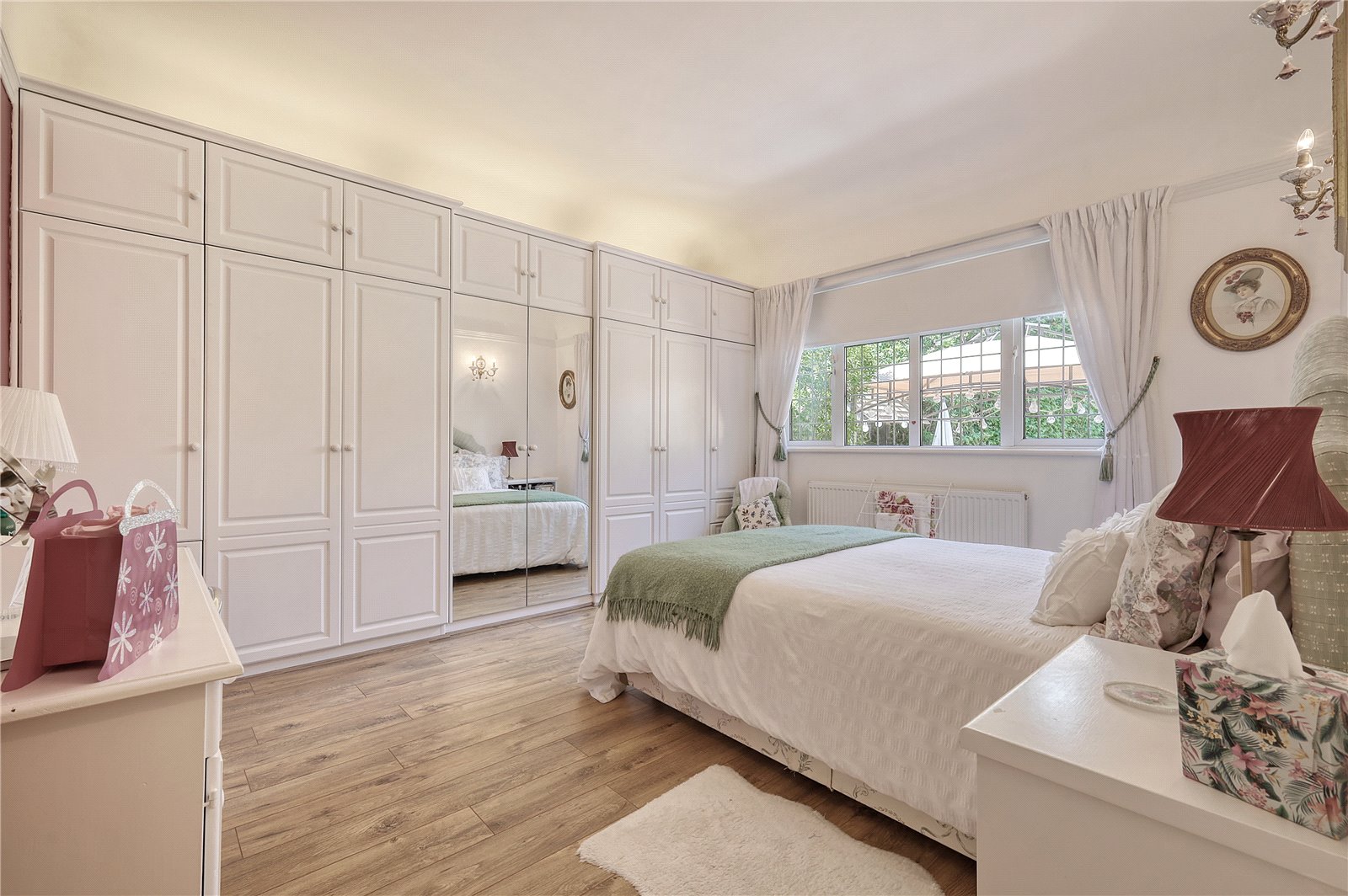 plus full width range of built in wardrobe cupboards. This bright double bedroom has a wide double glazed window overlooking the rear garden. Radiator. Picture rail. Attractive wood flooring.