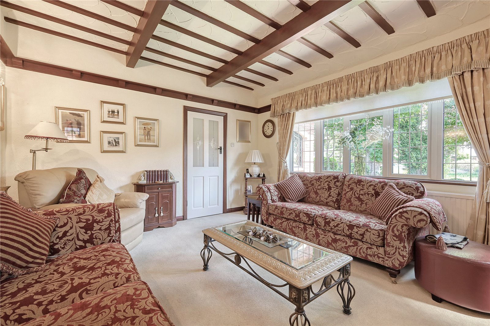 This bright and beautifully proportioned living room enjoys a dual aspect with two pretty stained glass leaded light windows to side and wide double glazed Oriel bay window to front. Radiator. Beamed ceiling. Delft shelf. Inglenook style fireplace with attractive arched redbrick fire with open grate.
