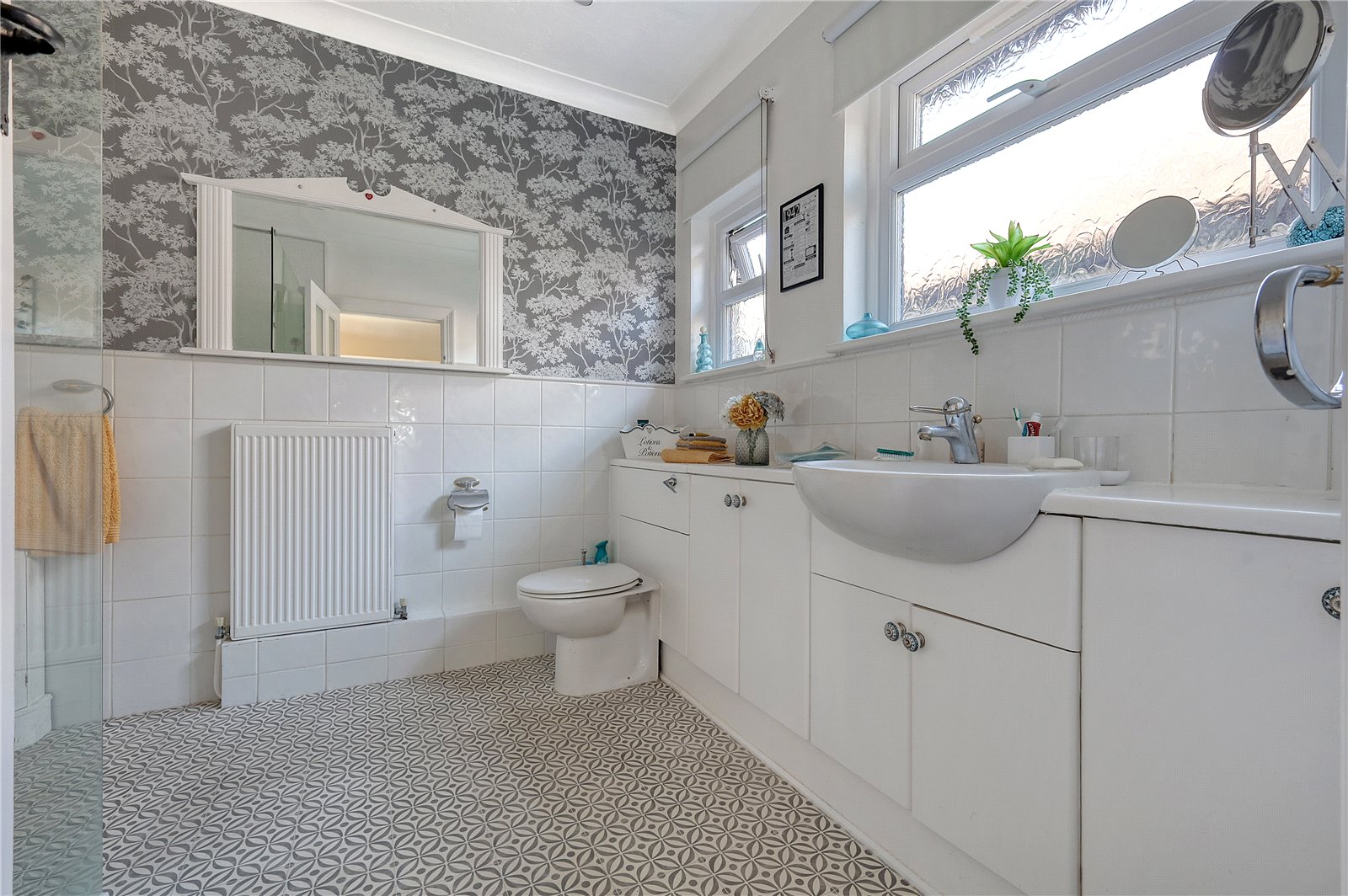 Spacious shower room fitted with a modern white suite comprising walk-in double shower cubicle. Vanity bar with wash basin and mixer tap, cupboards below. Concealed flush WC. Part tiled walls. Tiled effect flooring. Radiator. Coved ceiling with recessed lighting. Shaver point. Two double glazed windows to side.
