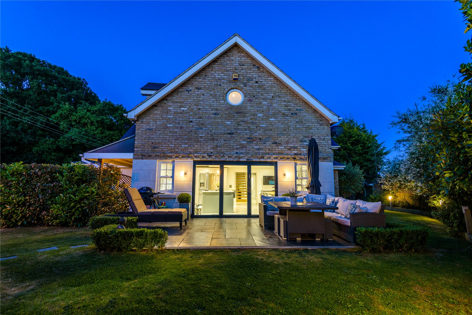The beautifully landscaped gardens wrap around the property and are arranged in three separate areas. The family garden commences from the kitchen/Family room with an extensive slate tiled terrace (ideal for dining al fresco) with walled and wrought iron railed frontage, screened rear boundary and an extensive lawned area with planted borders. This in turn leads to a smaller garden area to the rear of the utility room - again laid to lawn with screened borders. There is a further garden to the rear of the office/study offering space for childrens play equipment etc.
