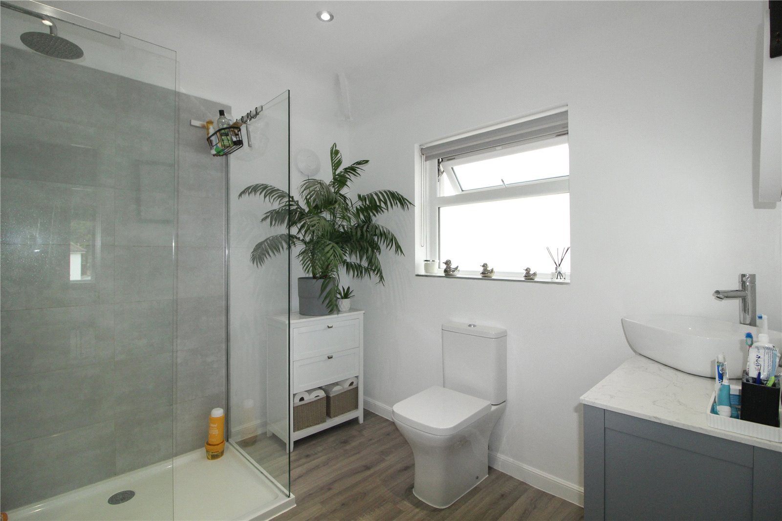 uPVC double glazed obscure window to side with fitted blinds to remain. Fitted with a beautiful and contemporary three-piece white suite comprising double-width walk-in tiled shower cubicle, wash basin with chrome monobloc mixer tap set upon vanity unit with cupboards under and low-level w.c. Wood-effect vinyl flooring. Skirting. Heated towel rail. Smooth plastered walls. Smooth plastered ceiling and recessed spotlights.