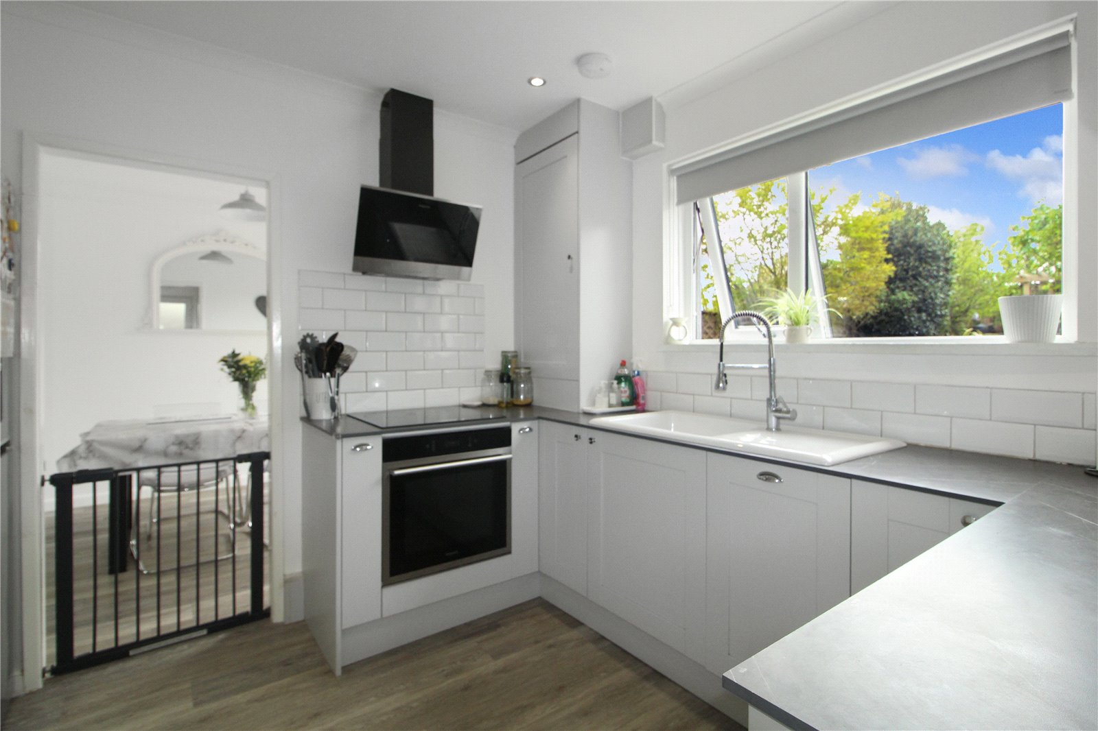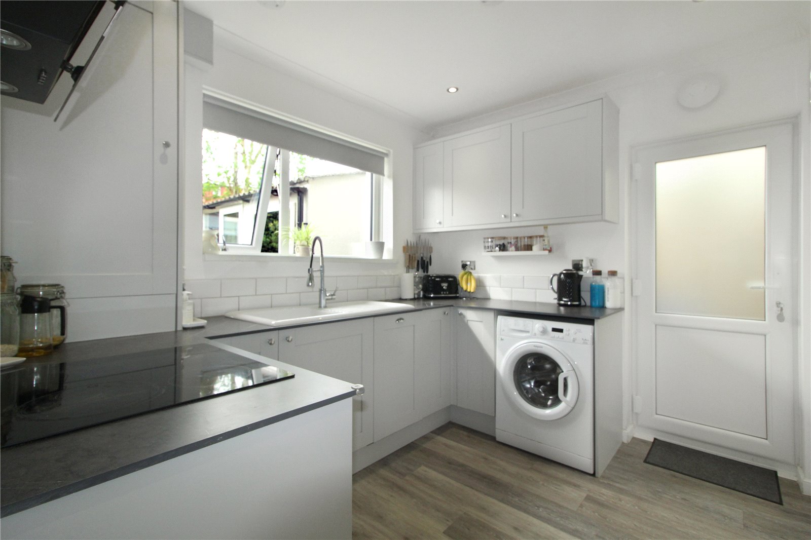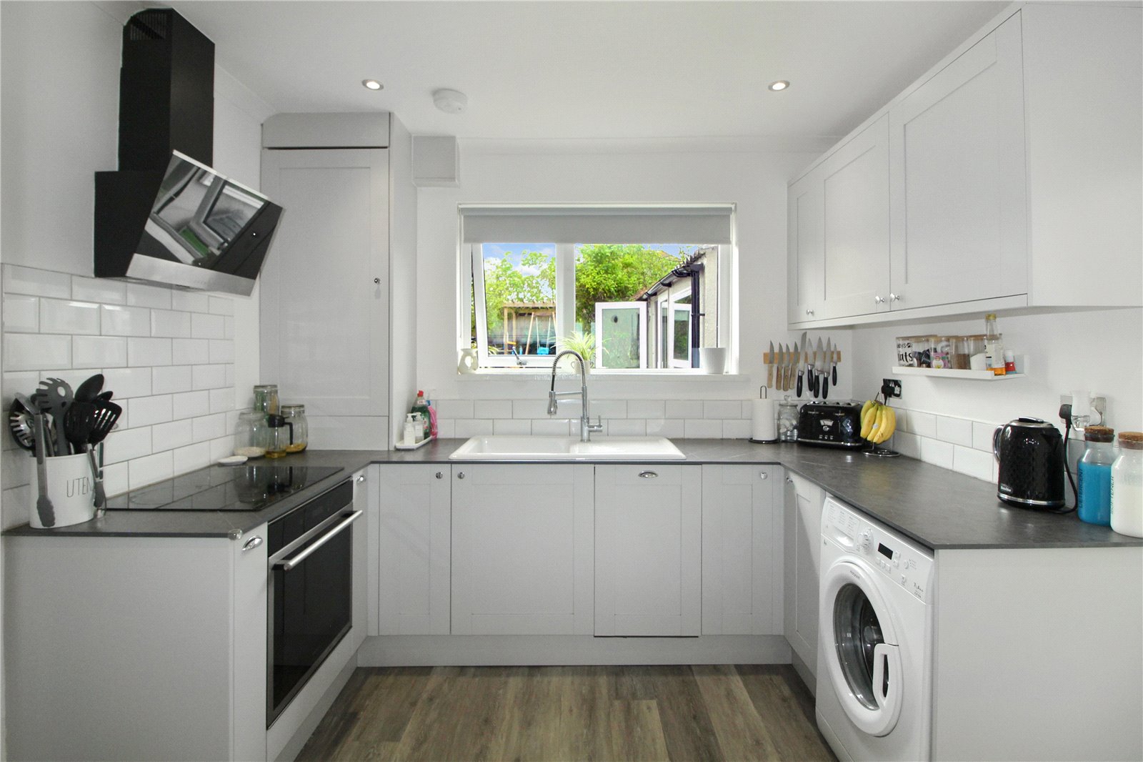 uPVC double glazed window to rear overlooking the West-Facing rear garden with fitted blinds to remain. uPVC door with double glazed obscure insert to side out to garden. Fitted with a worksurface comprising inset sink and drainer unit with pull-out tap, Hotpoint electric hob with Hotpoint extractor above and oven below.