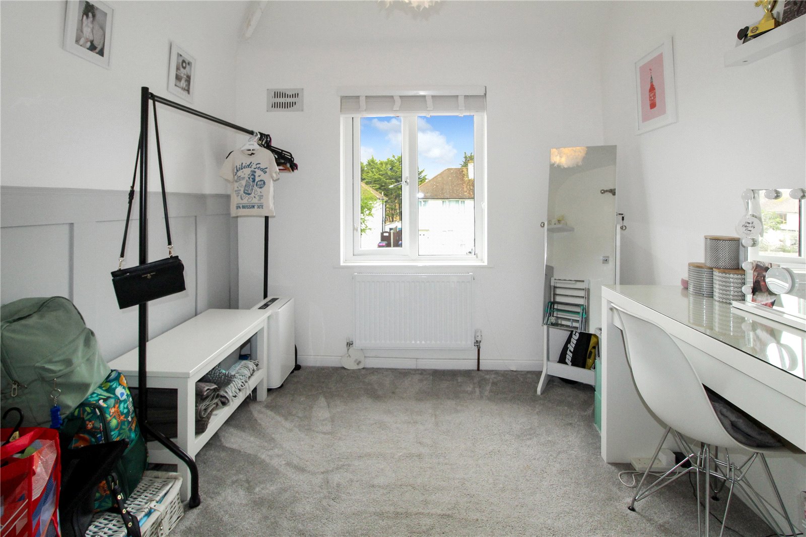 uPVC double glazed window to front with fitted blinds to remain. LVT wood-effect flooring. Skirting. Double-banked radiator. Base-level storage cabinet set within alcove with shelving above. Feature panelling to half-height to feature wall. Chrome light switch and sockets. Smooth plastered walls to the remainder. Coving to smooth plastered ceiling and ceiling light.