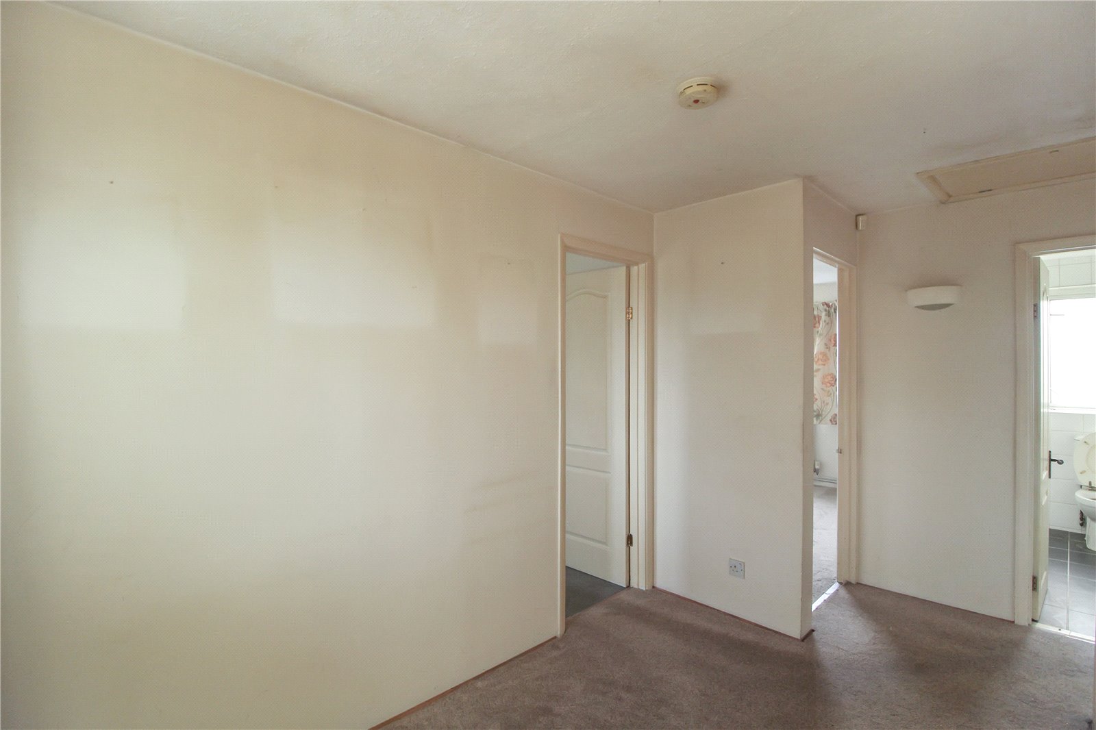 UPVC double glazed window with fitted shutters to front aspect looking out to the communal grounds. Carpet to floor, smooth plastered walls with wall lights, Fire alarm and access into the loft space. Doors leading to:
