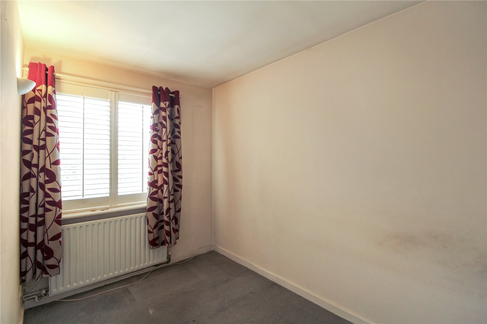 UPVC double glazed window with fitted shutters to front aspect looking out to communal grounds. Carpet to floor, two radiator, and smooth plastered walls with wall lights.