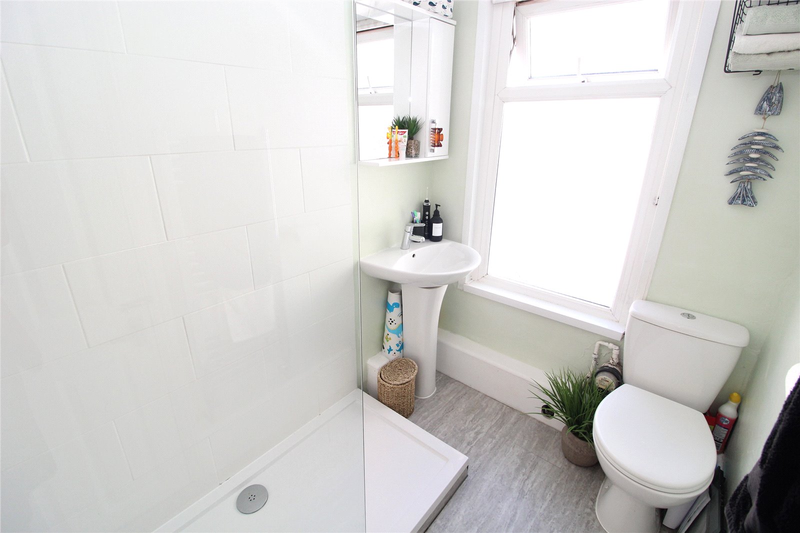 Fitted with three piece white suite comprising double width fully tiled shower cubicle with twin head shower and screen. Pedestal wash hand basin. Low flush w.c., Double glazed obscure window to side. Smooth plastered walls and ceiling. Heated towel rail.