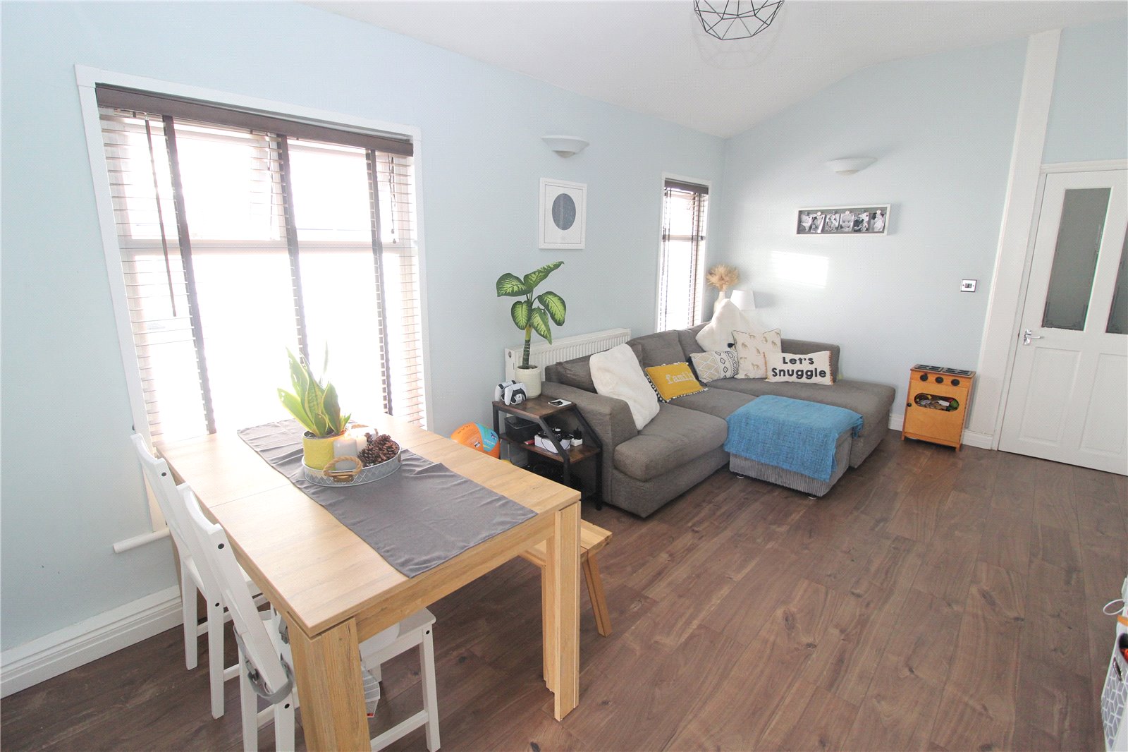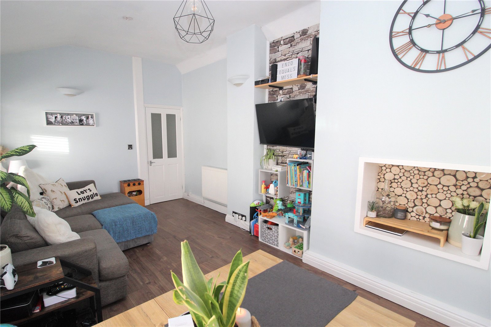 TV aerial point. Smooth plastered walls and ceiling. Wood effect laminate flooring. Recessed display shelving (formally fireplace). Open plan to