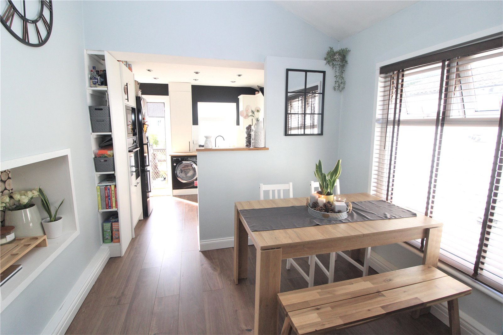 Kitchen with a range of contemporary units comprising bowl and a half colour matched sink unit with mixer taps set within a solid wooden worktop. Built-in four ring gas hob with extractor hood over. Eye level oven with recessed mircowave over, further cupboards above and below. Range of matching base cupboards and drawers, matching eye level cabinets over. Tiling to working surfaces. Matching cupboard housing wall mounted boiler serving central heating and domestic hot water. Double glazed window to rear. Smooth plastered walls and ceiling with inset spotlights. Space for upright fridge/freezer. Wood effect laminate flooring. Double glazed window to rear with glazed door adjacent giving access to garden.