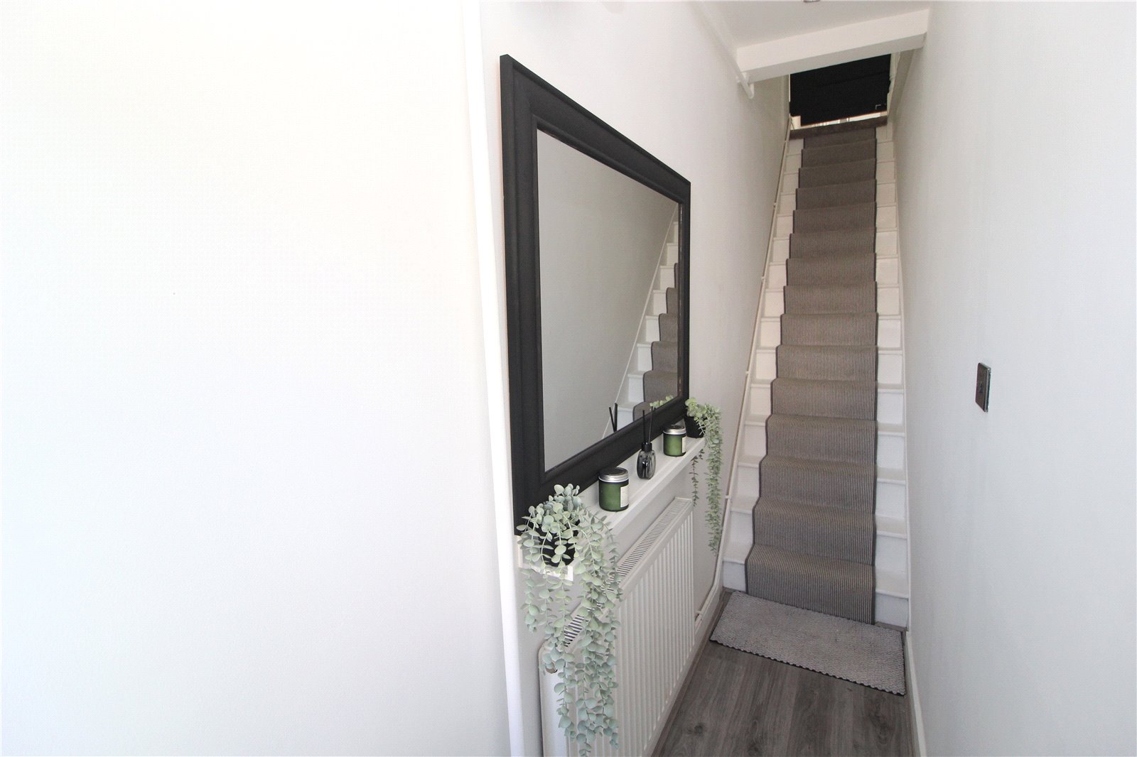 Staircase to first floor and landing. Wood effect laminate flooring. Radiator. Smooth plastered walls.
