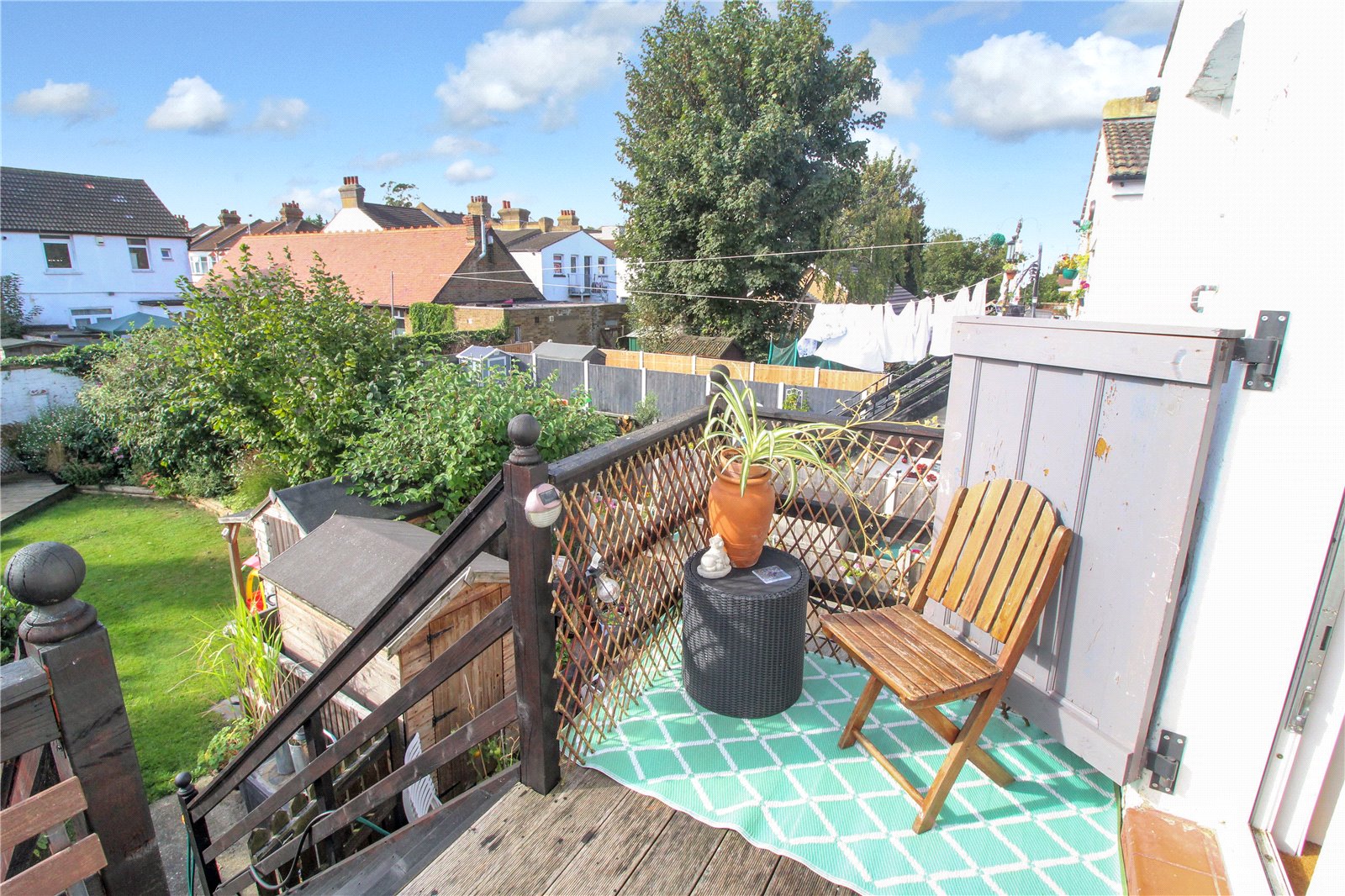 Small balcony/terrace area with steps leading down to: