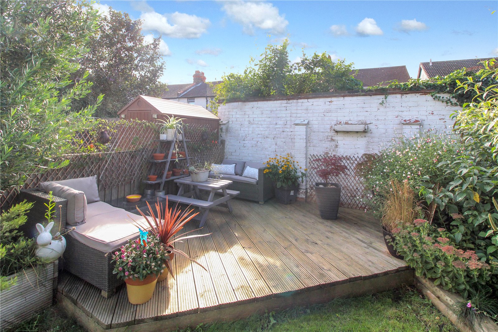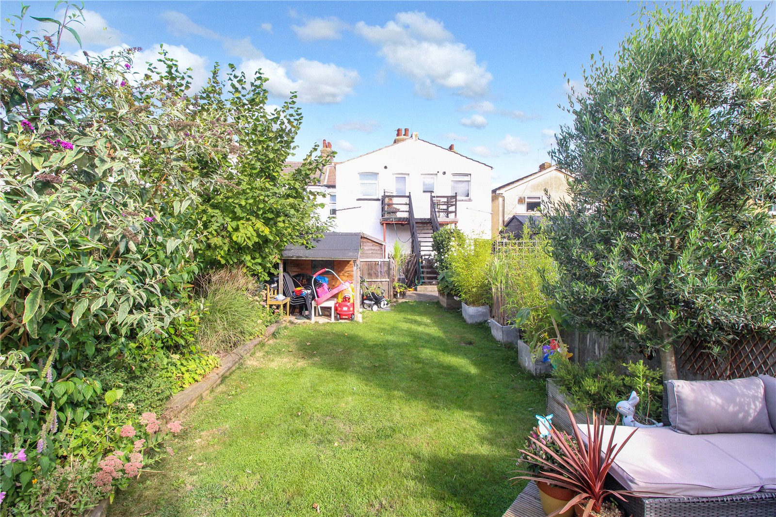 Rear Garden which is well tended with raised flower and shrub borders, the remainder of the garden is laid to lawn. Decked area to the rear. Fenced to boundaries. Timber garden shed.