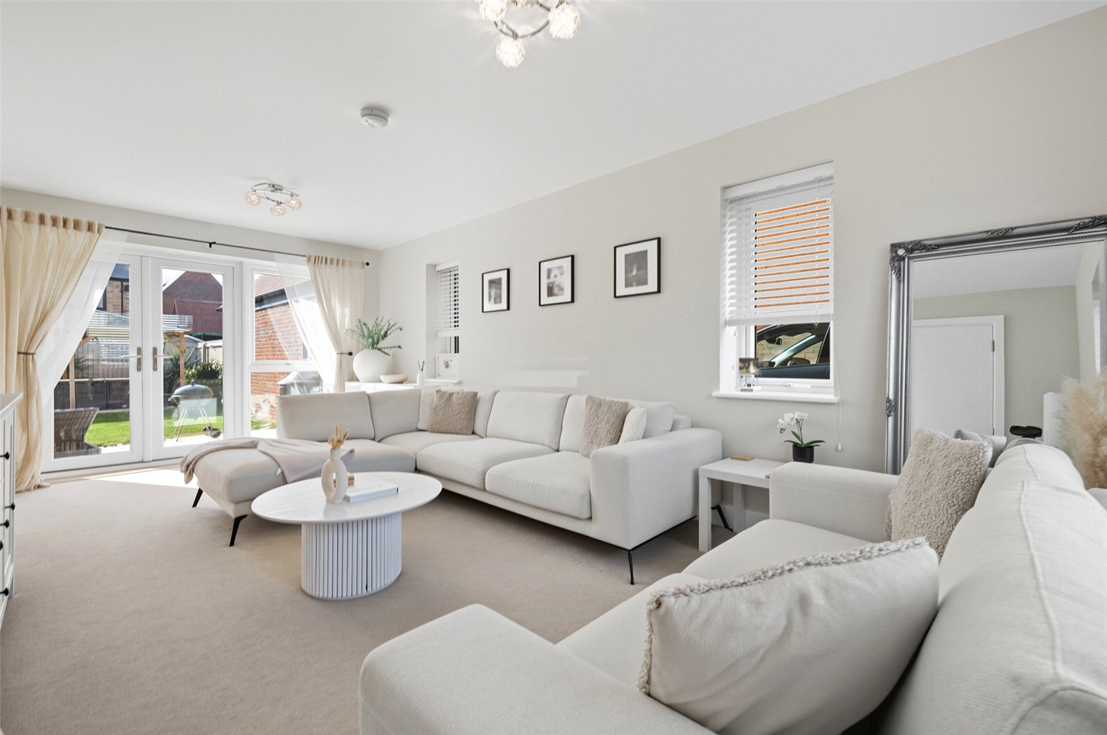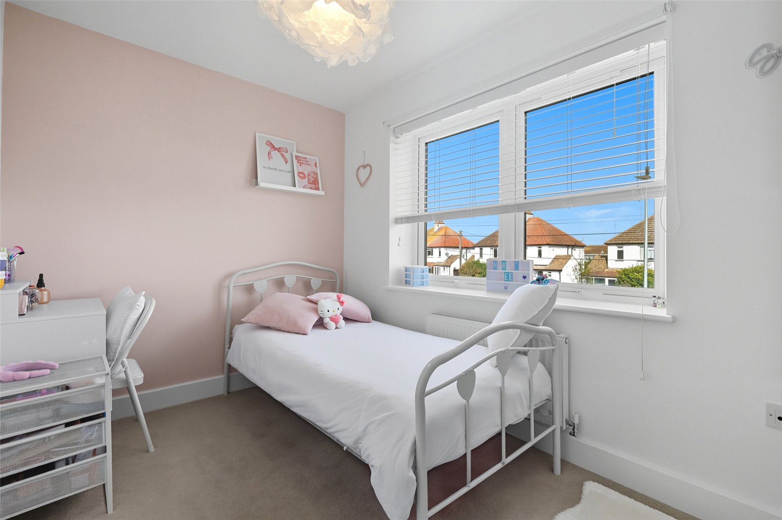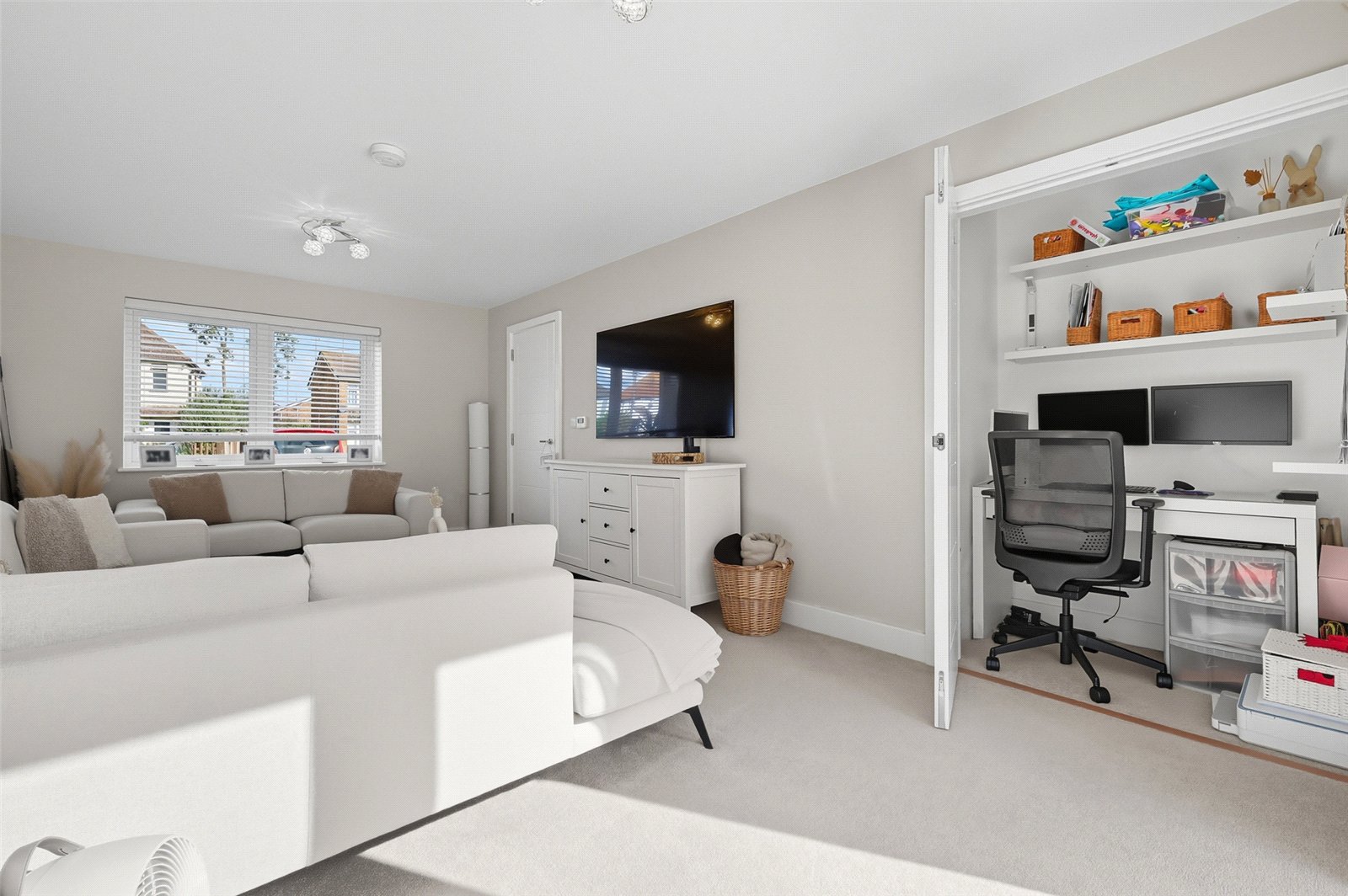 A triple aspect room with double glazed French doors giving access to the south facing landscaped rear garden and double glazed window to rear, and double glazed windows to front and side. Contemporary high level skirting. Television aerial point. Wall mounted central heating thermostat. Two radiators. Smooth plastered ceiling. A pair of white shaker doors give access to a double-fronted cupboard currently fitted as a home office area, with shelved storage and power connected.
