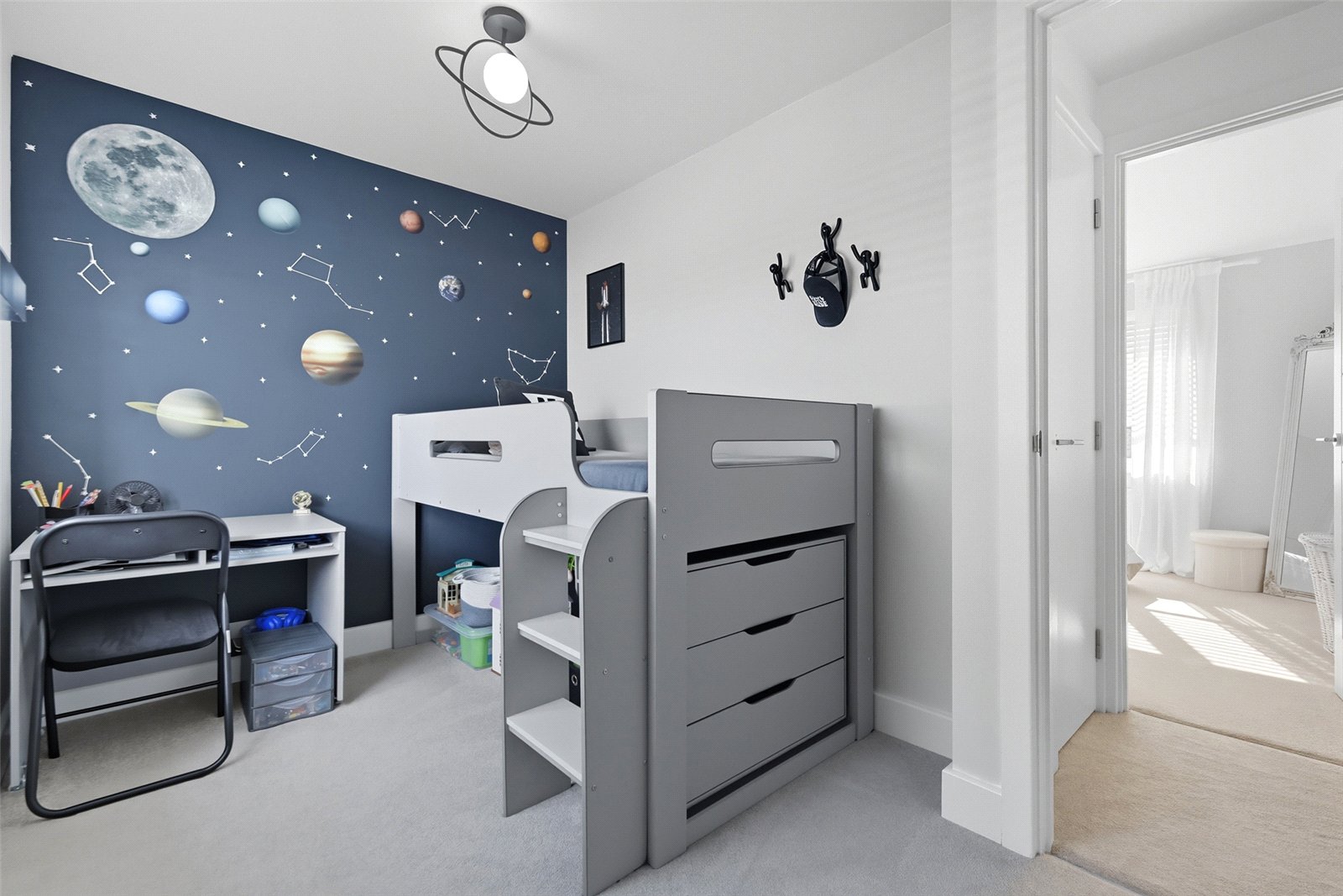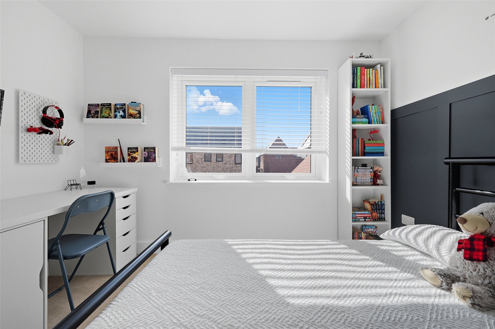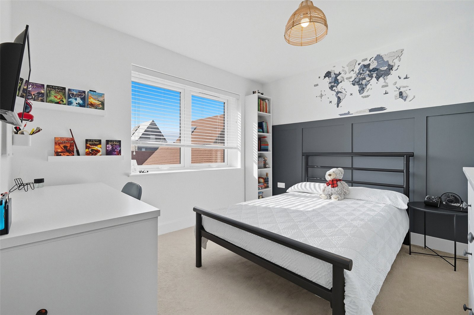 A triple aspect room with double glazed French doors giving access to the south facing landscaped rear garden and double glazed window to rear, and double glazed windows to front and side. Contemporary high level skirting. Television aerial point. Wall mounted central heating thermostat. Two radiators. Smooth plastered ceiling. A pair of white shaker doors give access to a double-fronted cupboard currently fitted as a home office area, with shelved storage and power connected.
