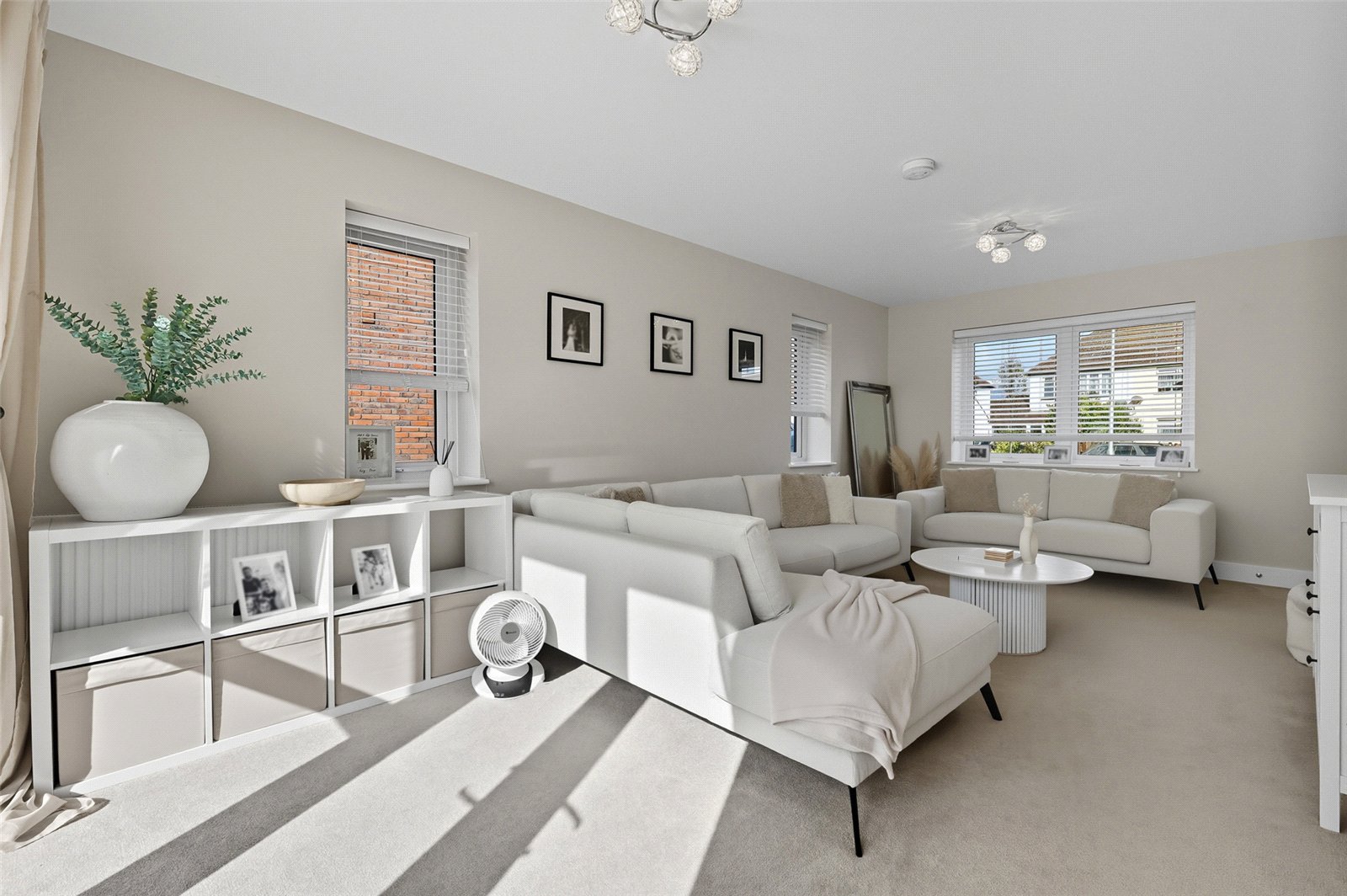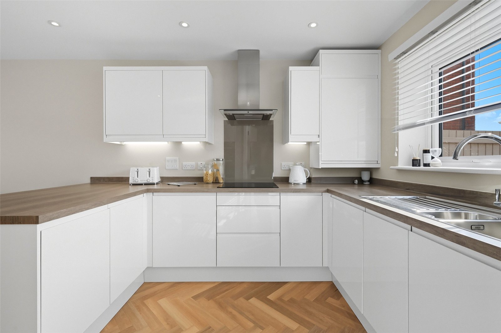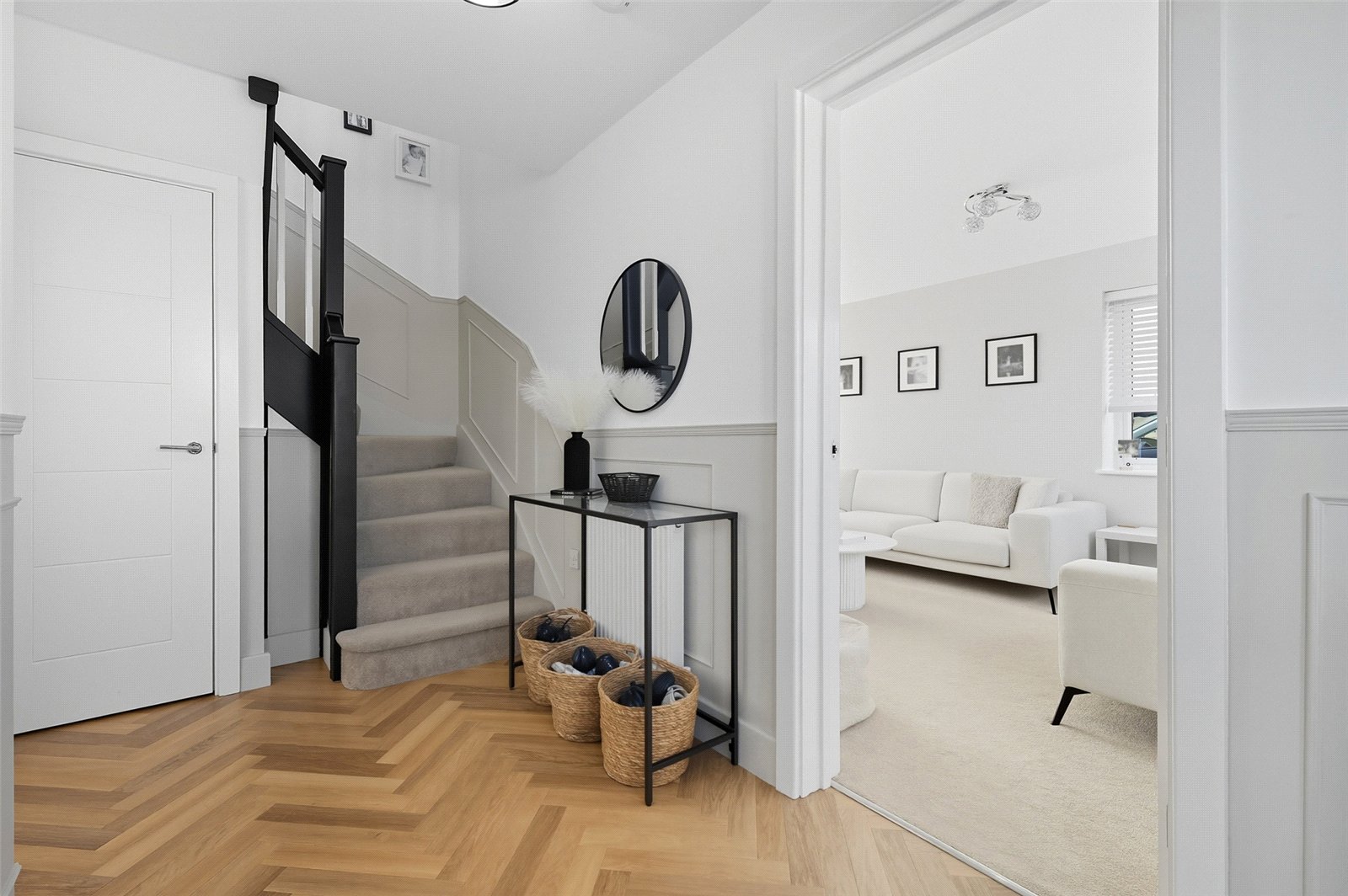 Karndean herringbone oak flooring. Feature panelling to dado height. Turned staircase to first floor landing. Access to understairs storage cupboard with trip switch box and comms points. Smooth plastered ceiling. Shaker style white contemporary doors lead off to all principal ground floor rooms.