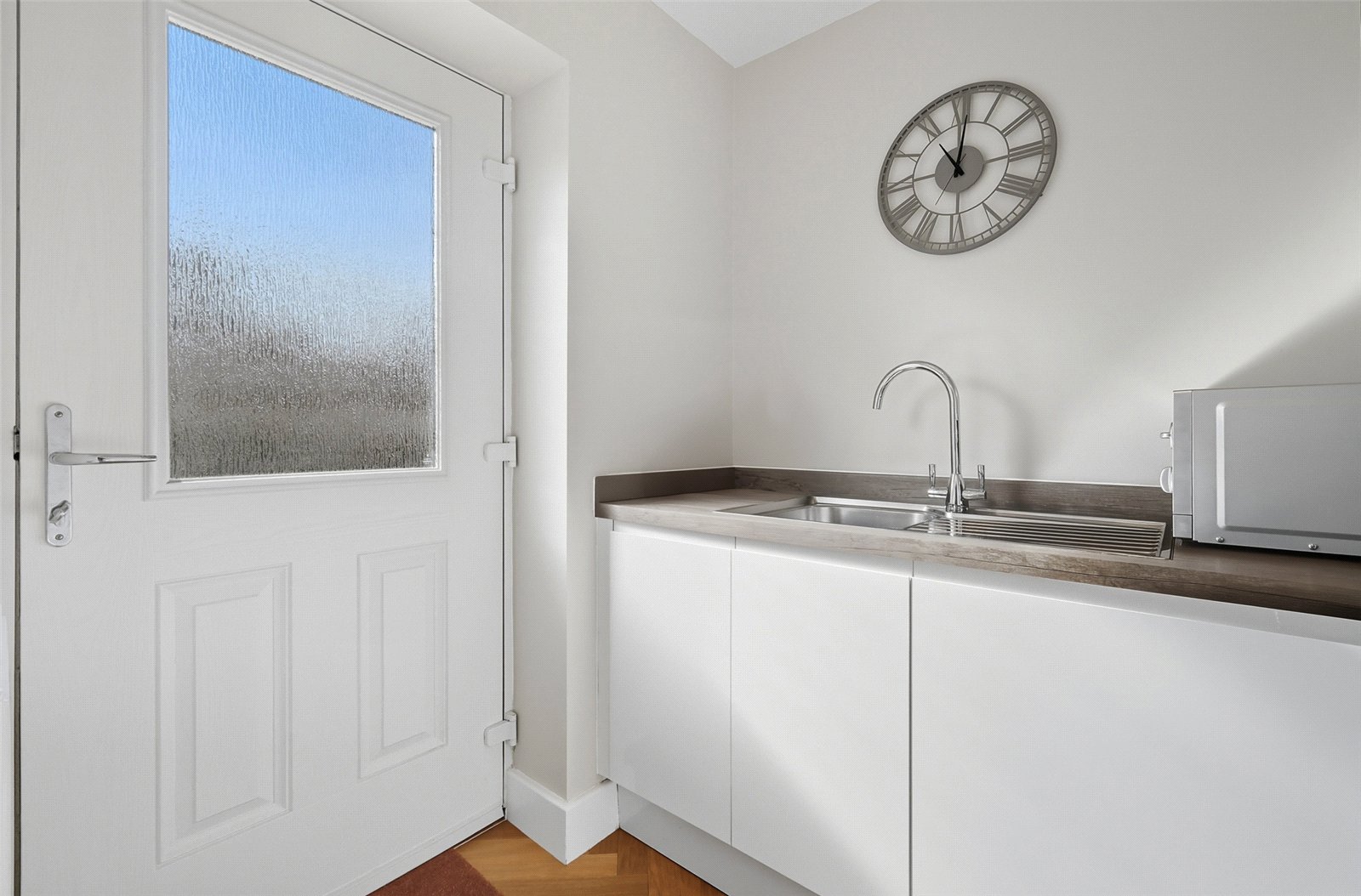 Obscure double glazed composite door gives access to the south facing rear garden. Radiator. Karndean herringbone oak flooring. Gloss fronted white base cabinets with oak effect squared edged working surfaces with upstands, and inset stainless steel sink unit with designer mixer tap. Integrated washer/dryer, and further storage space. Smooth plastered ceiling with extractor fan and recessed LED lighting.