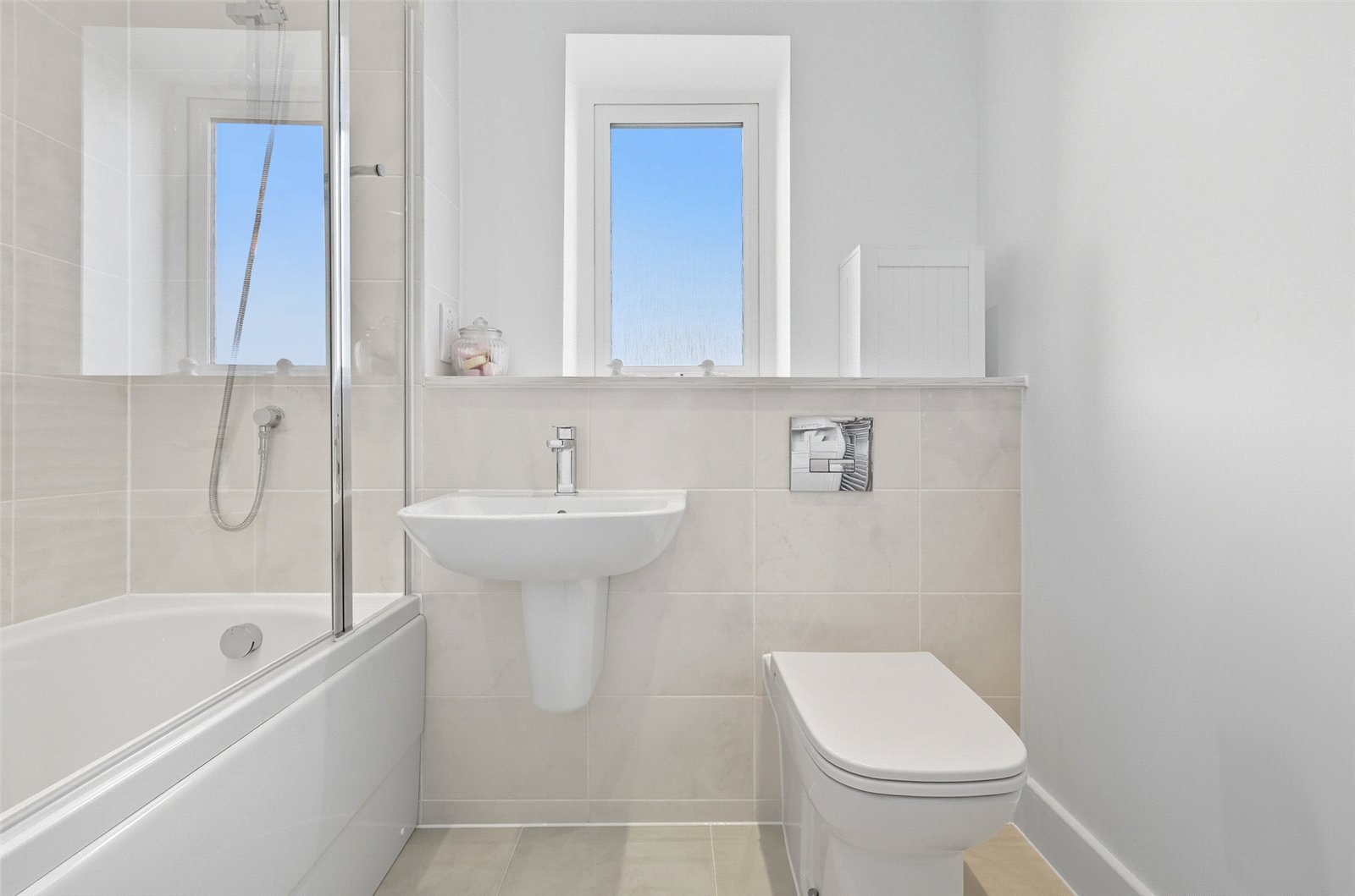Obscure double glazed window to front. Fitted with a three piece suite comprising panel enclosed bath with frameless glass shower screen and wall inset faucet shower, suspended wash handbasin with designer mixer tap, and integrated cistern WC. Full height heated towel rail. Tiled floor. Full tiling to bath and shower area, and half-height tiling to the remainder of one wall. Smooth plastered ceiling with recessed LED lighting and extractor fan.