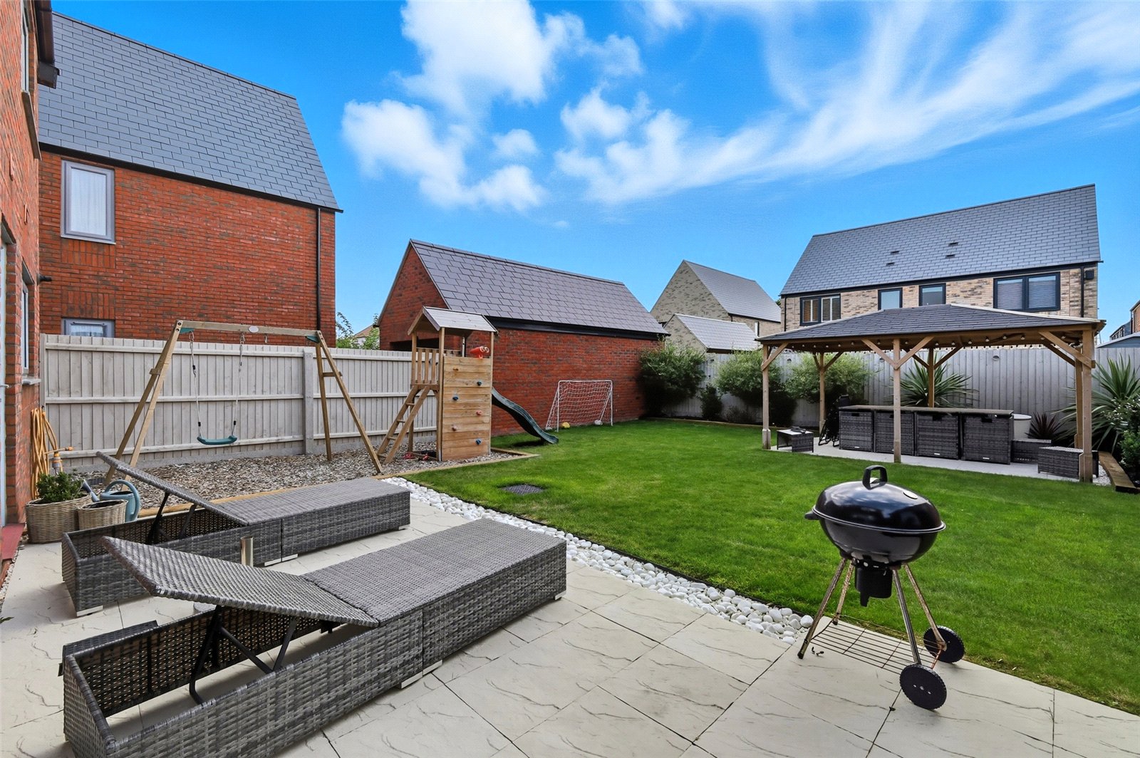 The professionally landscaped south facing rear garden commences from the kitchen/dining room and utility room/laundry with an extensive slate effect cream patio terrace ideal for dining alfresco. A barked play area and suntrap patio to rear, with bespoke timber gazebo with vaulted roof. Planted side borders. Fenced to side and rear boundary, with secure timber gated side access to the front of the property, and personal door to:
