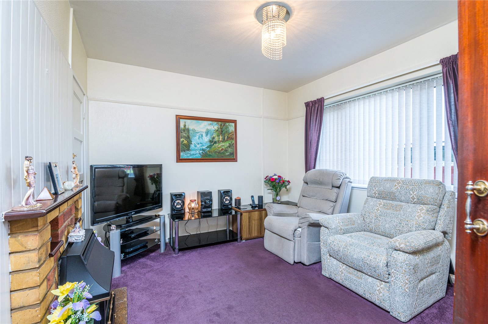 uPVC double glazed window to rear, overlooking the large landscaped rear garden. Feature brick fireplace with stone hearth and inset coal effect 'living flame' gas fire (untested). Access to two storage cupboards. Television aerial point. Picture rail.