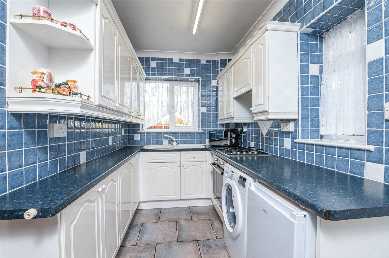 uPVC double glazed door giving side access to the front of the property and onto the rear garden, and uPVC double glazed windows to rear and side. The kitchen has been fitted with a comprehensive range of base and pelmeted eye level cabinets in gloss white, with granite effect rolled edged working surfaces and inset polycarbonate sink unit with mixer tap. The integrated appliances comprise a split level fan assisted electric oven in brushed steel with four ring gas hob and concealed extractor canopy above. Porcelain ceramic tiled floor with underfloor heating. Ceramic tiling to all walls with inset feature tiles. Corner display unit. Access to open-fronted larder cupboard with uPVC double glazed window to side. Ample appliance space, and larder shelving. Space, plumbing and drainage for automatic washing machine, and additional appliance space.