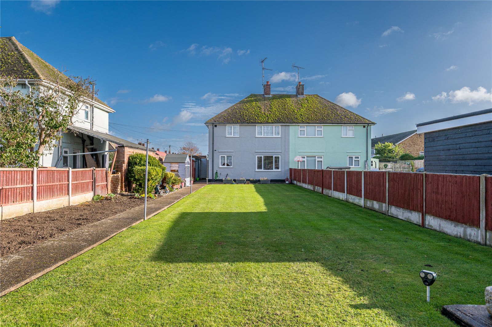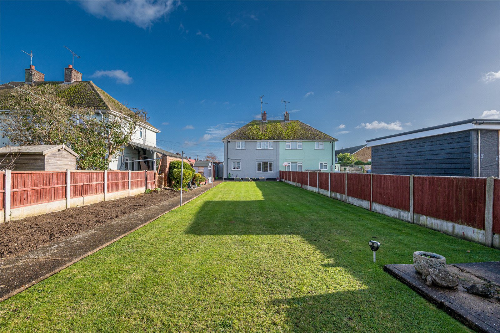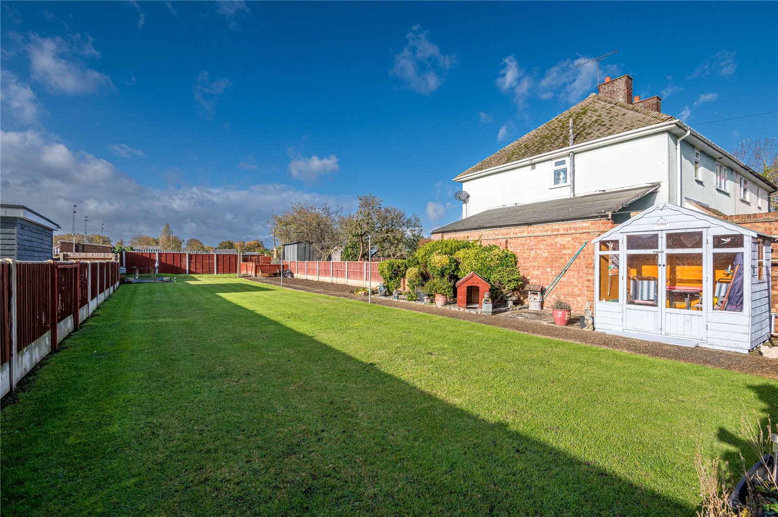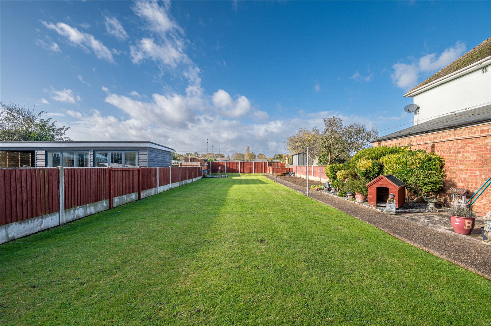 The rear garden commences from the kitchen with an extra-width sideway with secure timber gated side access to the front driveway, and a door giving access to a purpose built storage shed (with window to rear). The rear garden has a full width crazy paved patio terrace ideal for dining al fresco, with hardstanding to one side with space for several garden storage sheds. The garden is unusually wide and is west facing, with fencing to both sides and rear boundaries.
