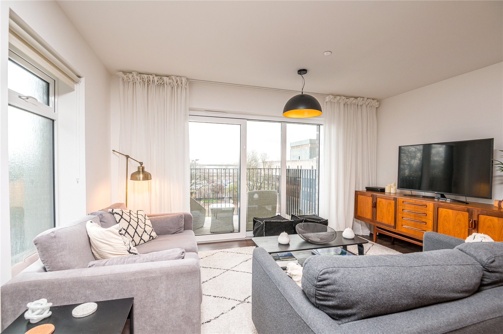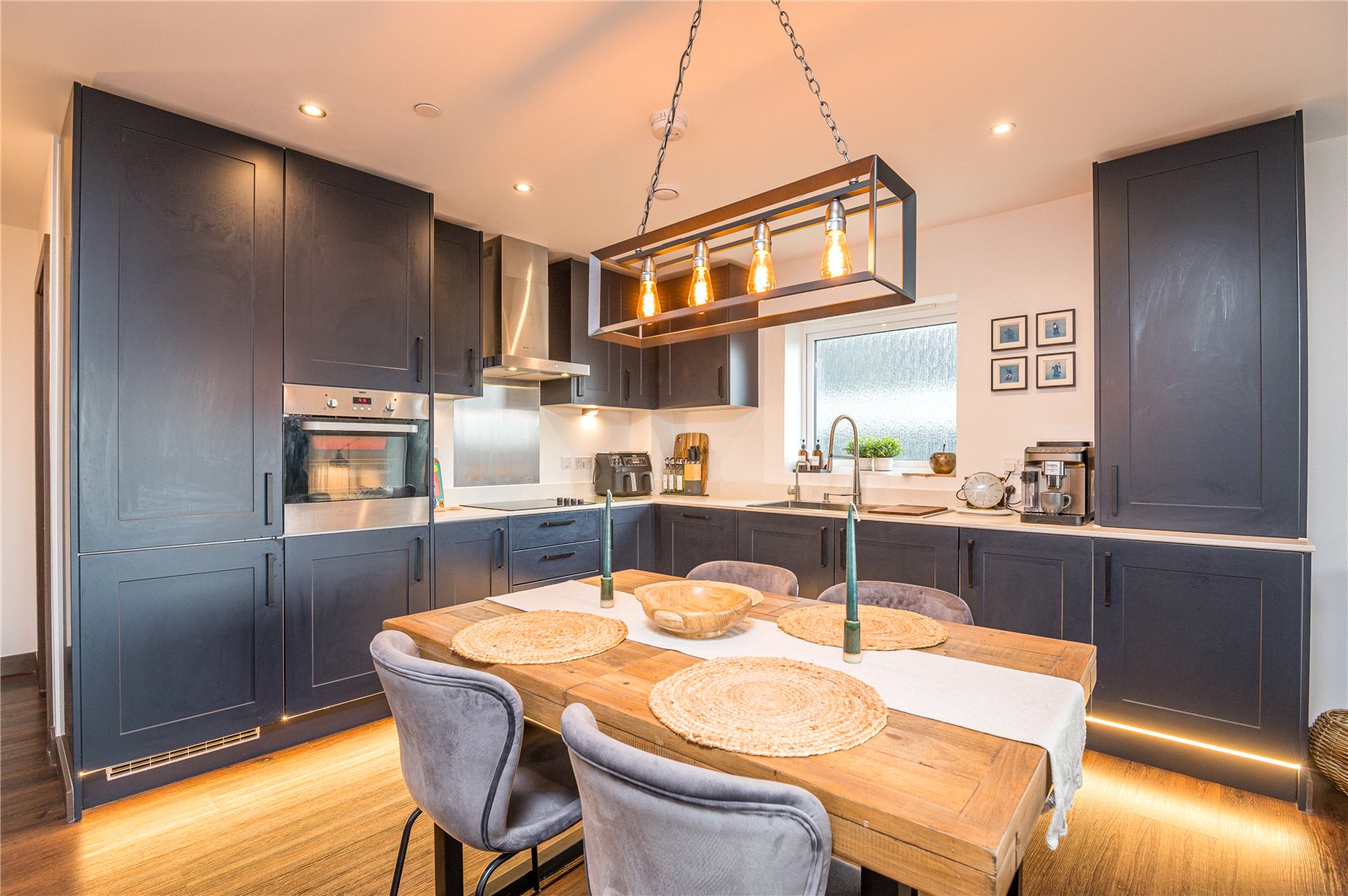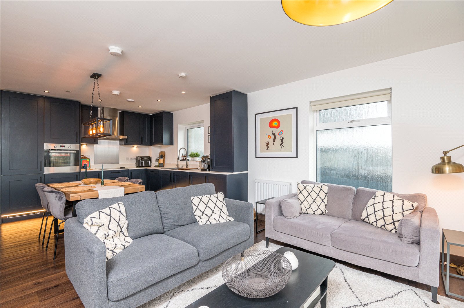 Large double glazed sliding patio door to front leading on to front balcony. Two double obscured glazed windows to side. Kitchen is fitted with a extensive range of modern and contemporary Shaker style cabinets incorporating a slim line Quartz working surface, inset stainless steel sink with mixer tap, with filtered water tap and instant hot water tap and integrated hand soap dispenser. Inset four burner ceramic hob with fitted extractor hood above. Integrated electric fan assist oven. Integrated dishwasher and fridge/freezer. Integrated undercounter washing machine. Separate cupboard housing Ideal combination gas fired boiler. Under cabinet lighting and kickboard LED lighting. Wood effect Karndean flooring throughout. Two wall mounted radiators. High level skirting. Wall mounted central heating control. Wall mounted entry phone system. Storage cupboard to side. Smooth plastered ceiling with partial LED lighting. Ceiling mounted ventilation. Drop pendant lighting to dining area. Door to side provides access to the: