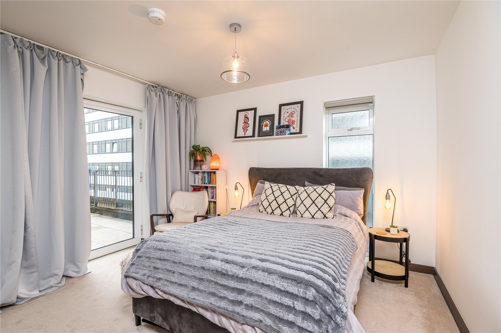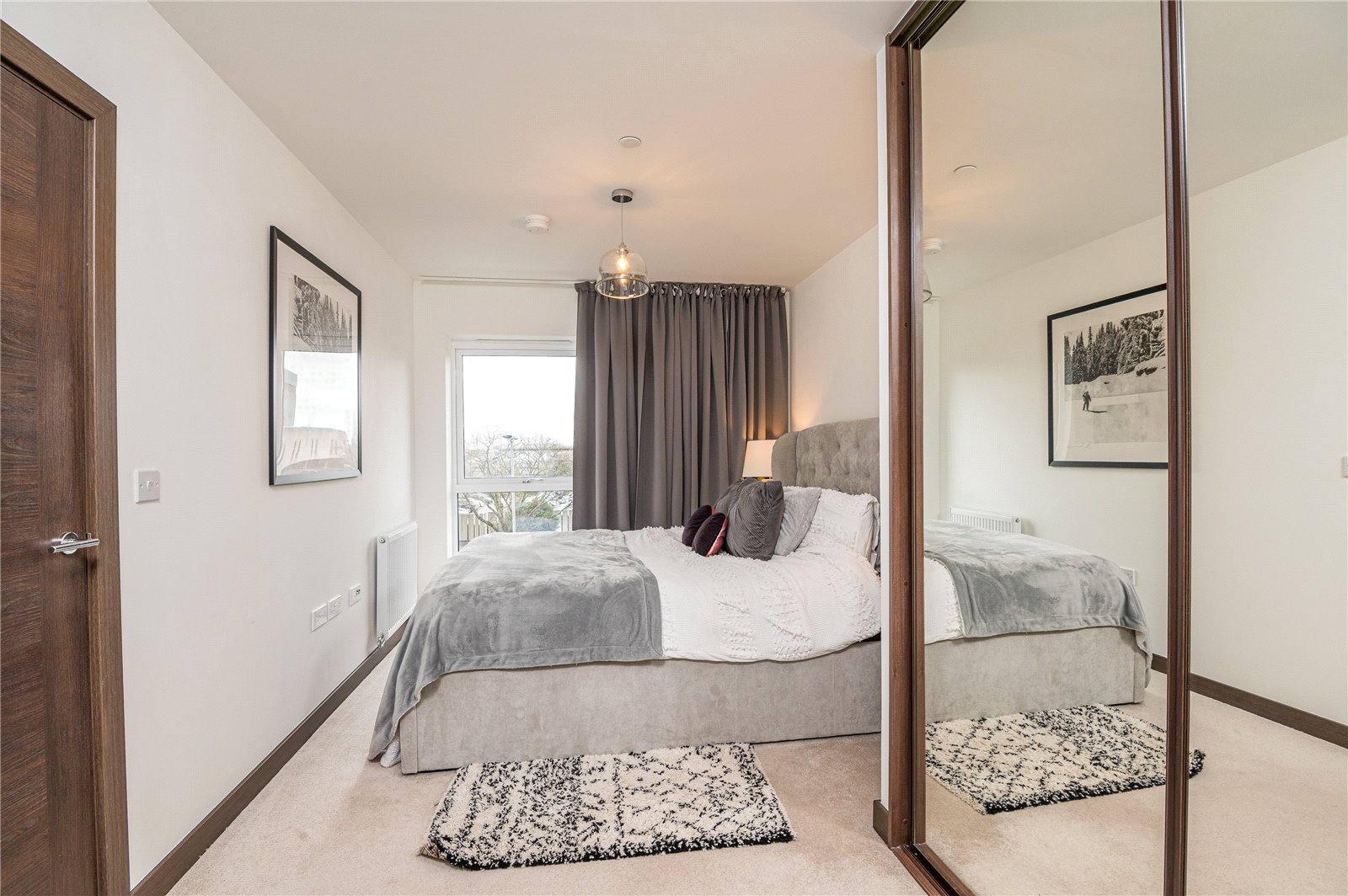 Large full height double glazed window to front. Wall mounted radiator. Fitted wardrobe unit with mirrored sliding doors. High level skirting. Smooth plastered ceilings. Partial recessed LED lighting. Further drop pendant. Door to rear provides access to the: