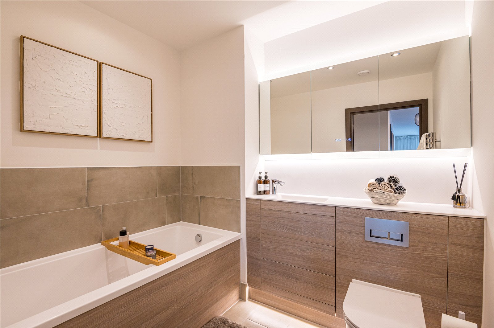 Fitted with a modern and contemporary three piece suite comprising concealed flush WC, countertop wash hand basin with digitally controlled mixer tap and larger than average panelled bath with recessed bath filler with Retractable overhead shower attachment and wall mounted electronic bath control. Chrome heated towel rail. Fully tiled floors. Large fitted storage drawers. Fitted vanity mirror with integrated LED lighting and heating feature. Integrated clock with storage behind. Part tiled walls. Smooth plastered ceilings with recessed LED lighting. Ceiling mounted extractor fan.