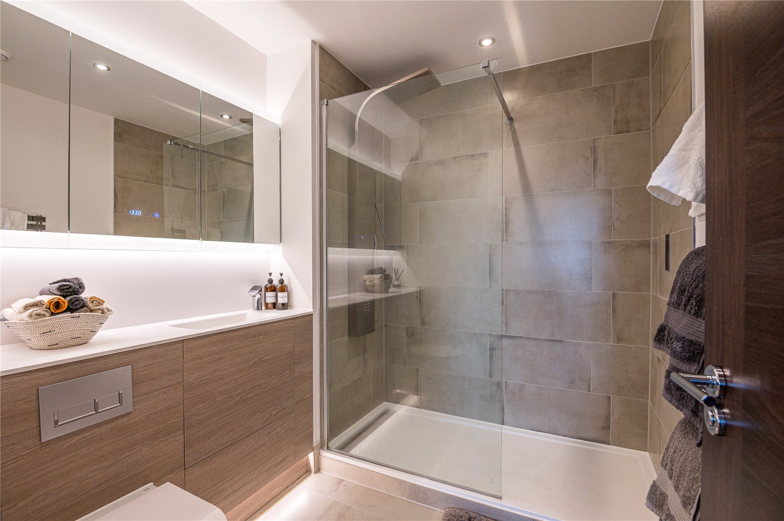 Contemporary three piece comprising concealed flush WC, countertop wash hand basin with electronically controlled mixer tap and storage drawers beneath. Larger than average low level walk in shower cubicle with wall mounted electronic touch screen controls. Contemporary stainless steel rainfall showerhead with integrated body jets with further detachable showerhead. Contemporary chrome heated towel rail. Large vanity mirror with storage cupboard behind, integrated LED feature and heat. Integrated clock. Fully tiled floors. Part tiled walls. Smooth plastered ceilings with recessed LED lighting. Ceiling mounted extractor fan.