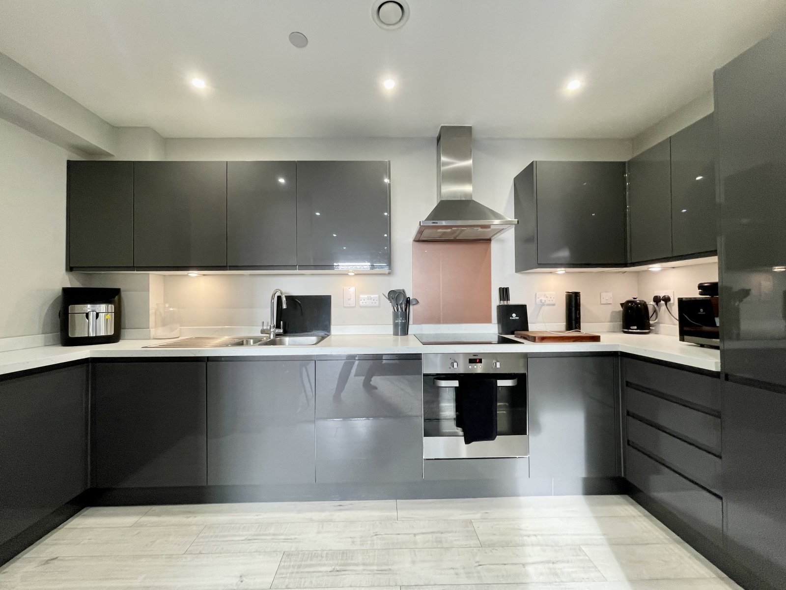 Kitchen is fitted with a modern and contemporary range of high gloss base and eye level units incorporating a square edged working surface, inset stainless steel one and a half bowl with mixer tap and drainer unit. Inset four burner ceramic hob with canopied extractor hood above. Integrated Zanussi electric fan assist oven beneath. Integrated washing machine. Integrated under counter dishwasher and full height fridge/freezer. Glass splash back to hob area. Wood effect laminate flooring. Smooth plastered ceiling with recessed LED lighting. Ceiling mounted extractor fan.