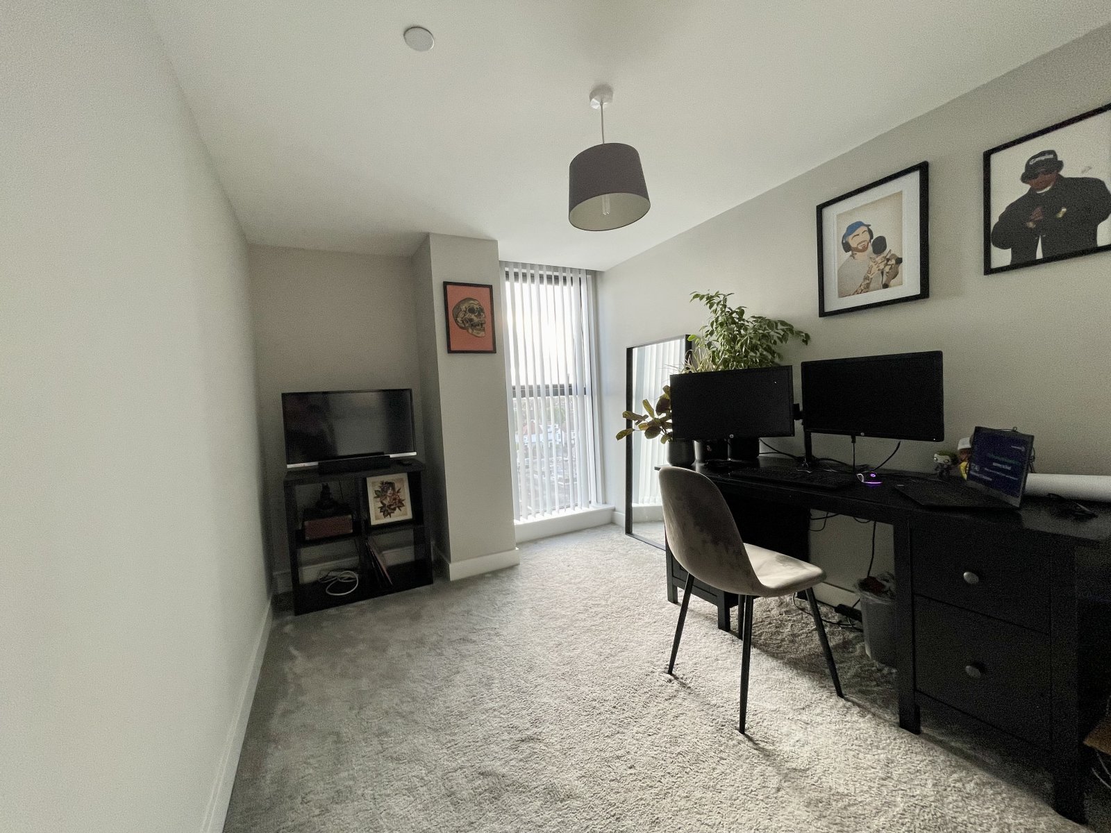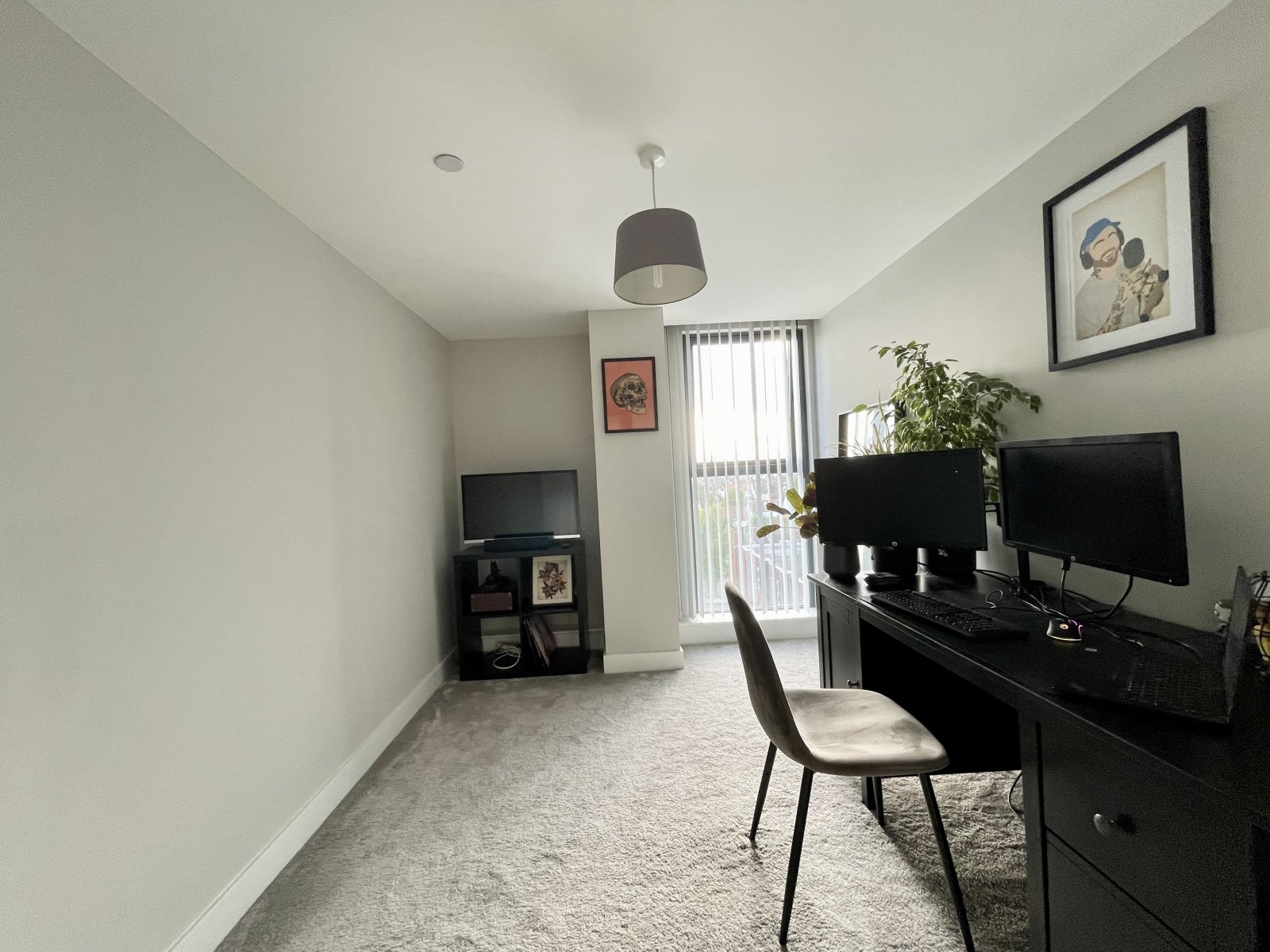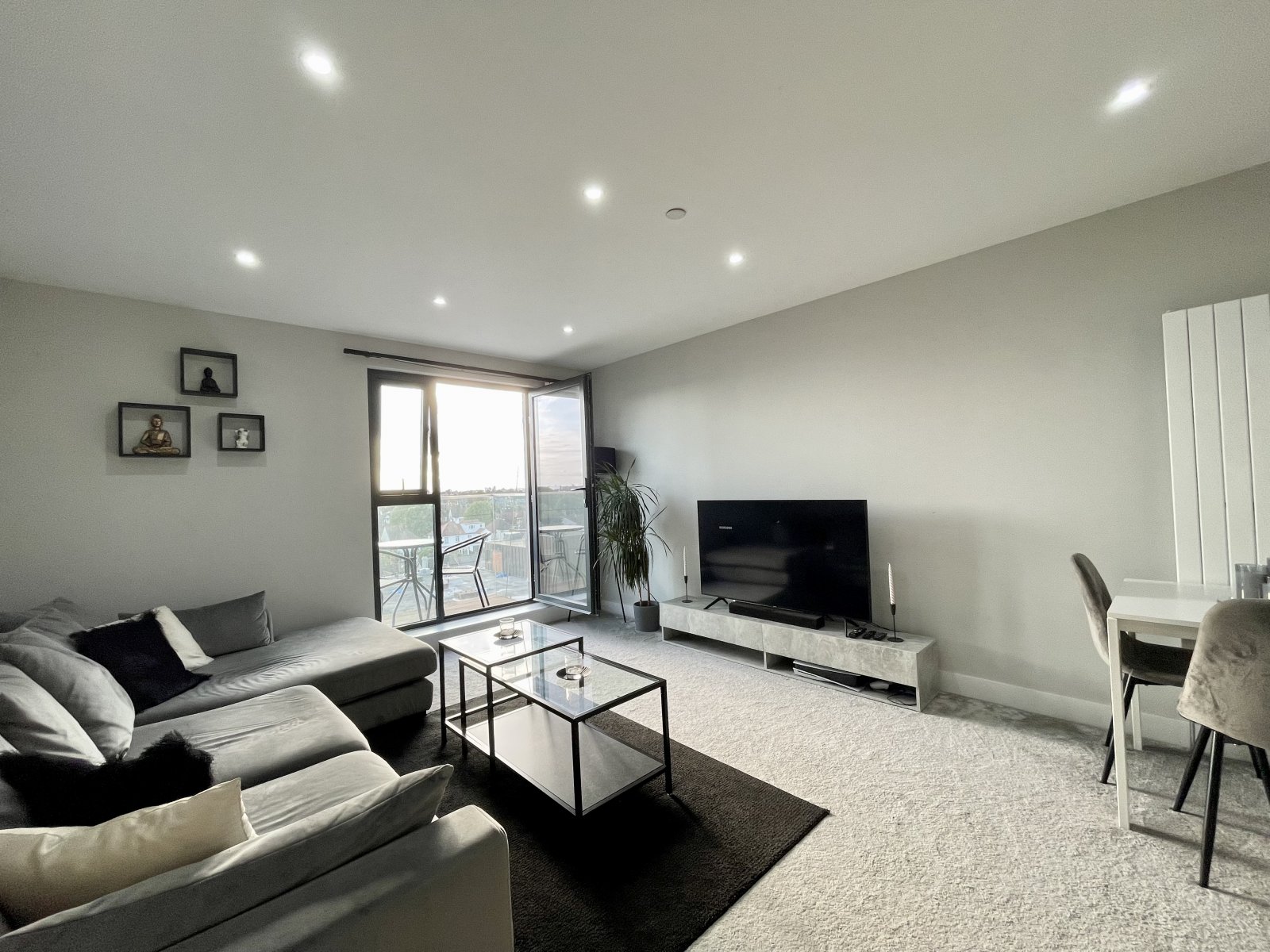 Large full height West facing double glazed window affording views towards Southend City Centre. High level designer radiator. High level skirting. Smooth plastered ceiling.