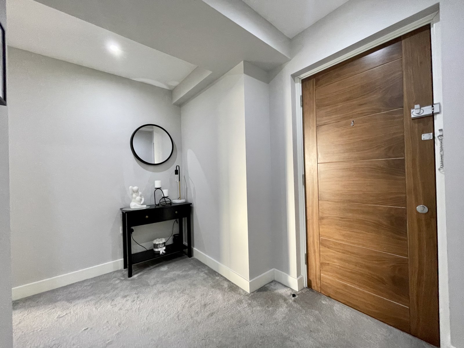Approached via hardwood security door with wall mounted entry phone system, wall mounted thermostatic heating control. High level designer radiator. High level skirting throughout. Smooth plastered ceiling with recessed LED lighting. Doors lead off to all rooms. Storage cupboard to side.
