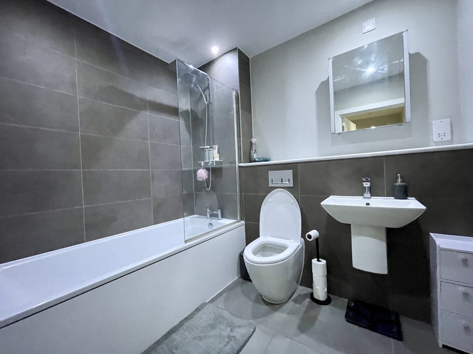Bathroom is fitted with a modern and contemporary three piece suite comprising concealed WC, wall mounted was hand basin with mixer tap, panelled bath with mixer tap plus separate overhead shower with rainfall showerhead plus detachable shower attachment. Wall mounted mixer. Chrome heated towel rail. Fully tiled floors. Part tiled walls. Wall mounted medicine cupboard with vanity mirror and integrated lighting. Wall mounted shaver charging point. Smooth plastered ceiling with recessed LED lighting. Ceiling mounted extractor fan.