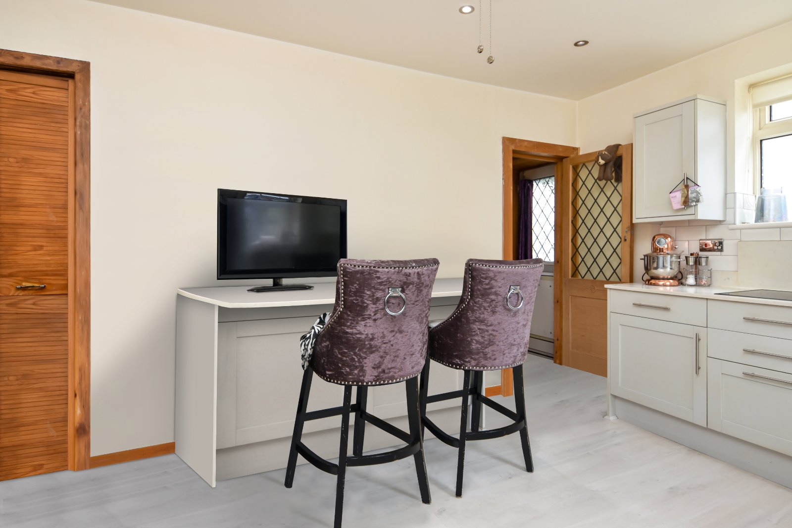 uPVC double glazed window to rear and further part obscure double glazed window to side aspect. The recently installed Kitchen is fitted with a beautiful range of eye and base level units with slow closing drawers and pan drawers. Feature marble worksurfaces inset with single bowl ink unit with designer style mixer tap over and grooved drainer. The range of 'Neff' appliances include under counter integrated dishwasher, built in eye level double oven/microwave with split level four ring induction hob. Attractive splashback tiling. Light coloured laminate wood effect flooring. To one aspect there is a good size feature island/Breakfast bar seating area with further marble worktop with storage cabinetry under. Pair of doors to under stairs storage cupboard which has been shelved. Smooth plastered ceiling inset with recessed lighting. Part glazed leaded door to;