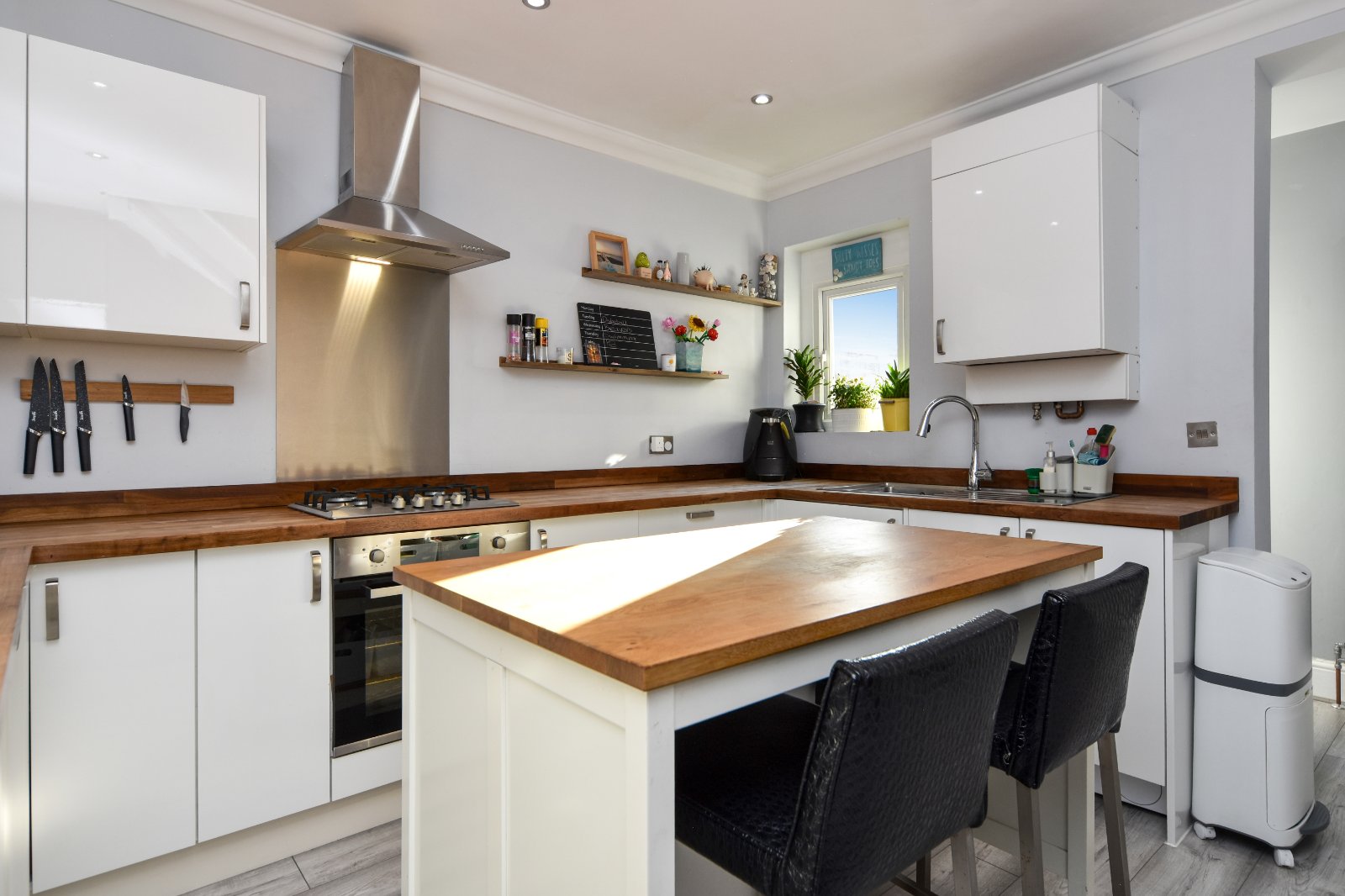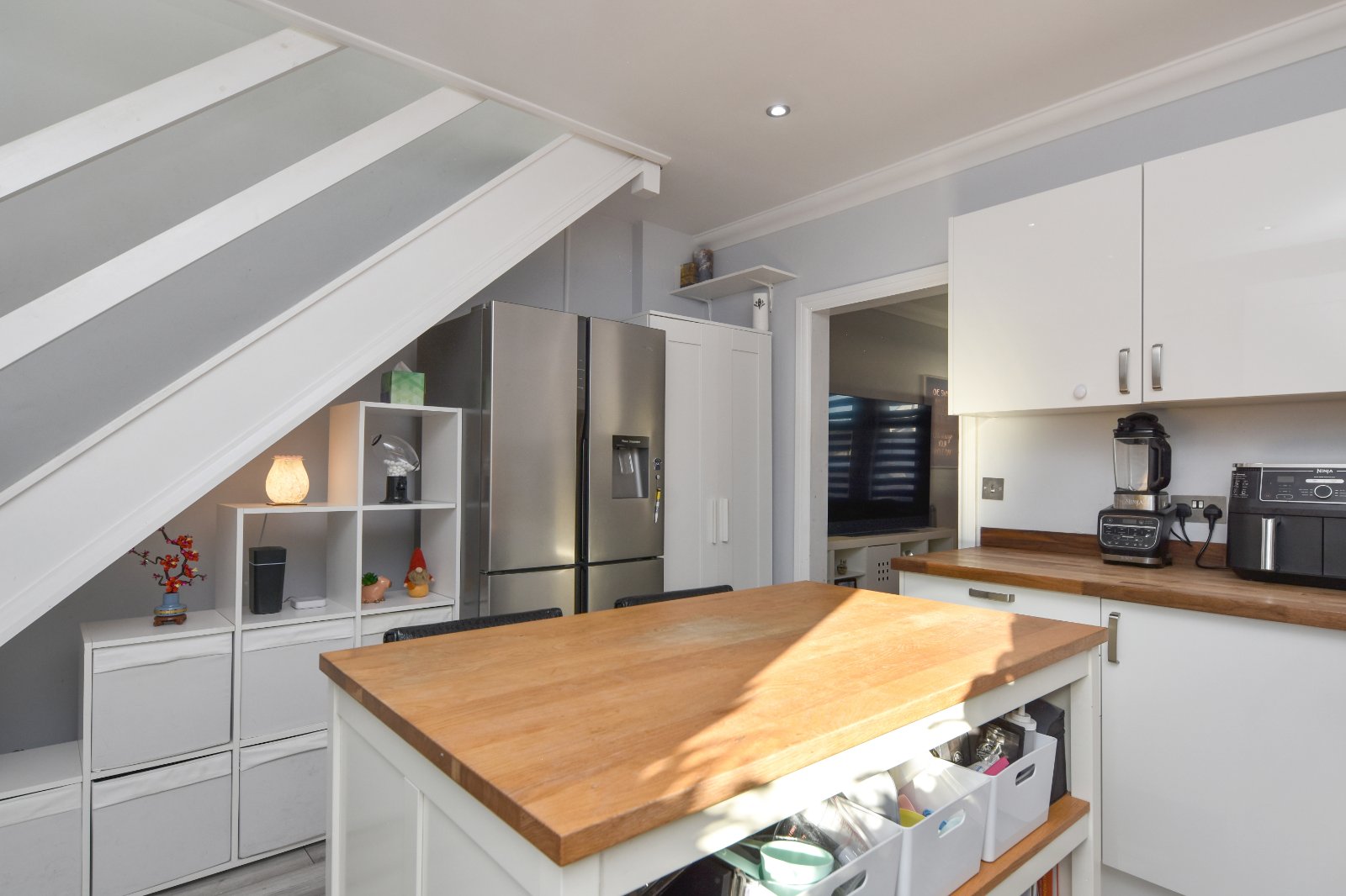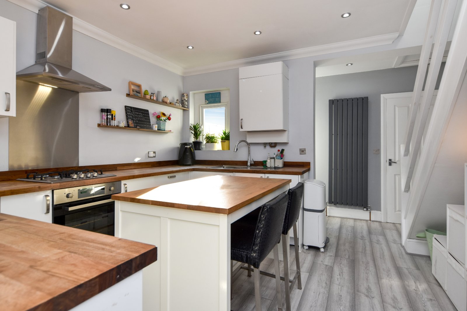 Double glazed window to rear aspect. The Kitchen is fitted with a comprehensive range of modern white high-gloss base and wall-mounted units, complemented by solid wood block work surfaces and matching upstands, inset with single drainer stainless steel sink unit with mixer tap. Built in electric 'Candy' oven with four ring gas hob over with stainless steel splashback and extractor canopy above. Integrated appliances include 'Hotpoint' dishwasher and 'Bush' washing machine. Space for fridge/freezer. Attractive laminate tile-effect flooring continues throughout. Concealed wall mounted 'Ideal' boiler. Open plan layout with space for central breakfast island (please note that the current island maybe available to any interested parties). Coving to smooth plastered ceiling inset with recessed lighting. To the rear of the Kitchen there is the staircase to first floor. Obscure uPVC double glazed door to side aspect providing access to the Garden. Contemporary flat panelled vertical radiator. Panelled door to;