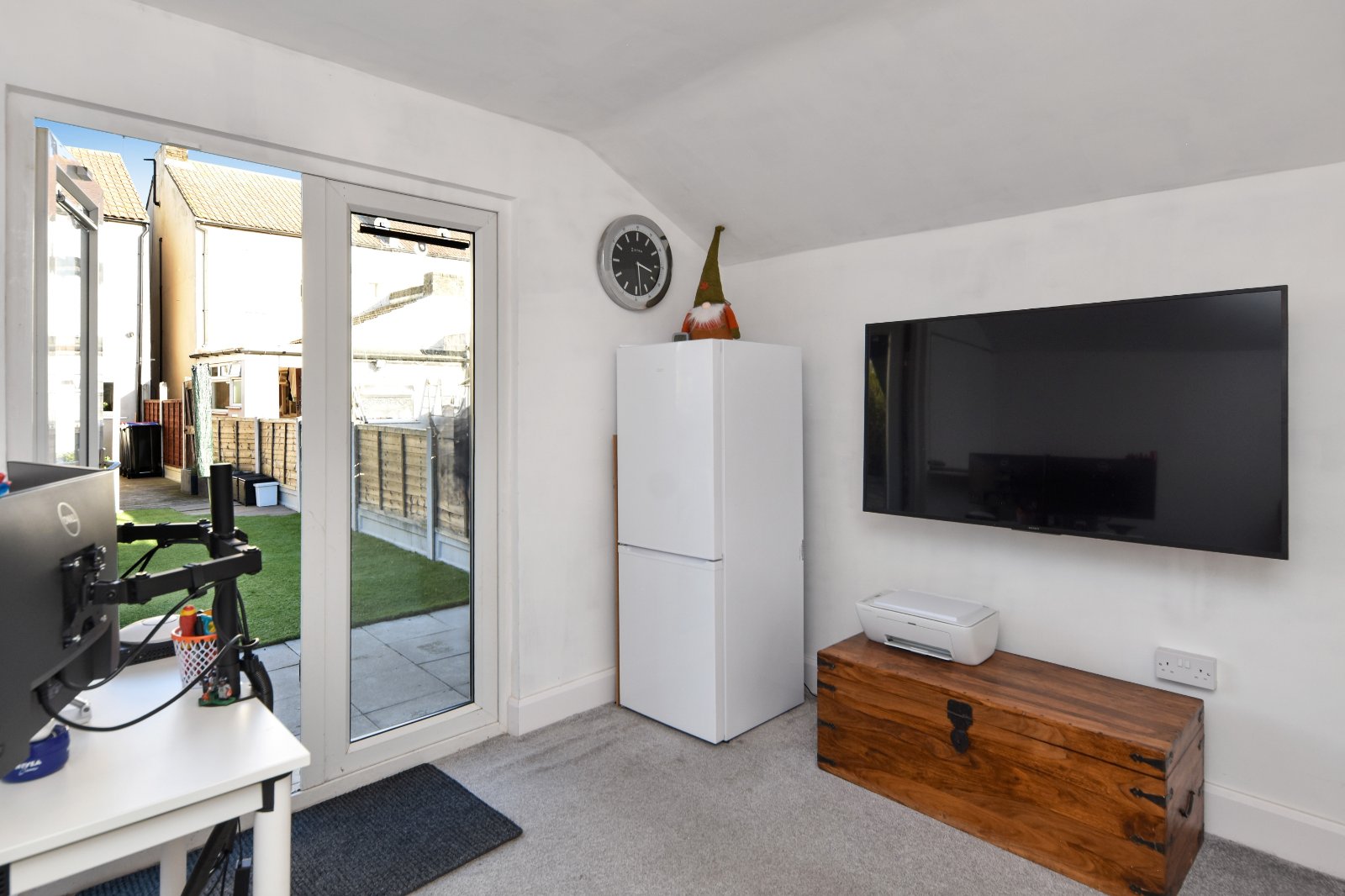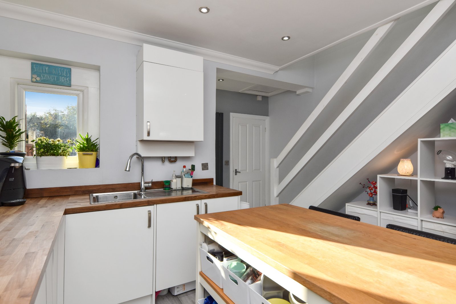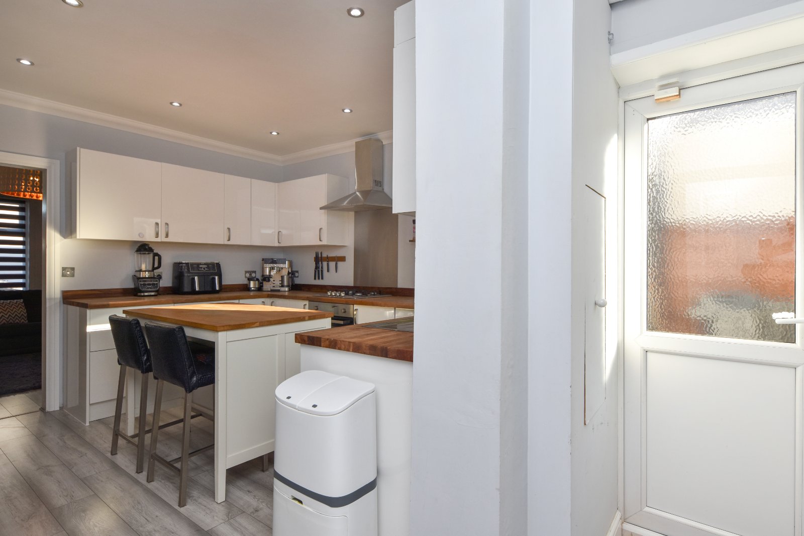 Double glazed window to rear aspect. The Kitchen is fitted with a comprehensive range of modern white high-gloss base and wall-mounted units, complemented by solid wood block work surfaces and matching upstands, inset with single drainer stainless steel sink unit with mixer tap. Built in electric 'Candy' oven with four ring gas hob over with stainless steel splashback and extractor canopy above. Integrated appliances include 'Hotpoint' dishwasher and 'Bush' washing machine. Space for fridge/freezer. Attractive laminate tile-effect flooring continues throughout. Concealed wall mounted 'Ideal' boiler. Open plan layout with space for central breakfast island (please note that the current island maybe available to any interested parties). Coving to smooth plastered ceiling inset with recessed lighting. To the rear of the Kitchen there is the staircase to first floor. Obscure uPVC double glazed door to side aspect providing access to the Garden. Contemporary flat panelled vertical radiator. Panelled door to;