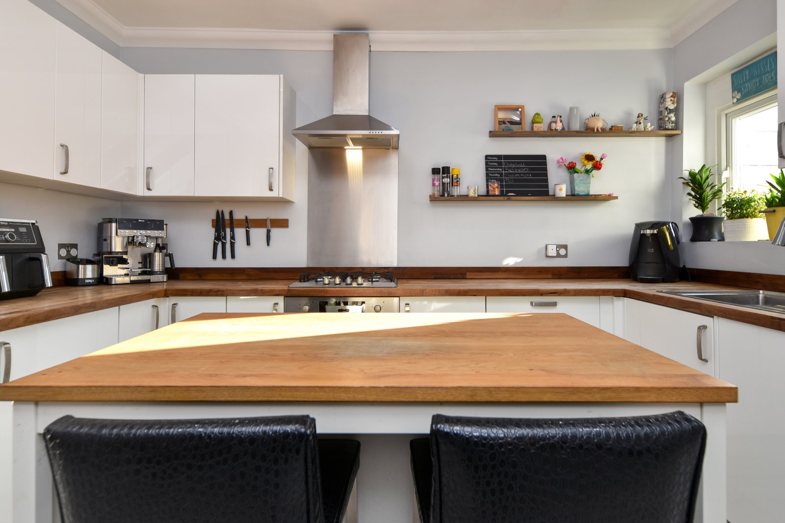 Kitchen / Dining Room;- A superb, modern kitchen fitted with sleek white units complemented by wooden worktops with a central island. Includes integrated appliances such as a dishwasher and washing machine, oven and gas hob with extractor, and space for dining.