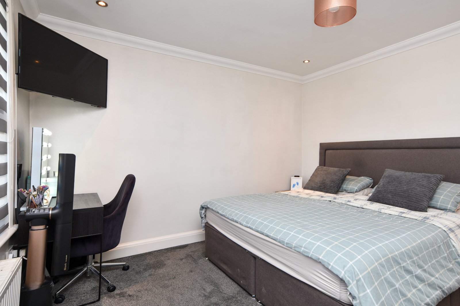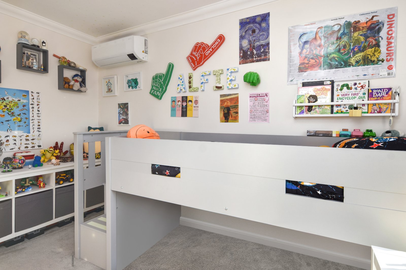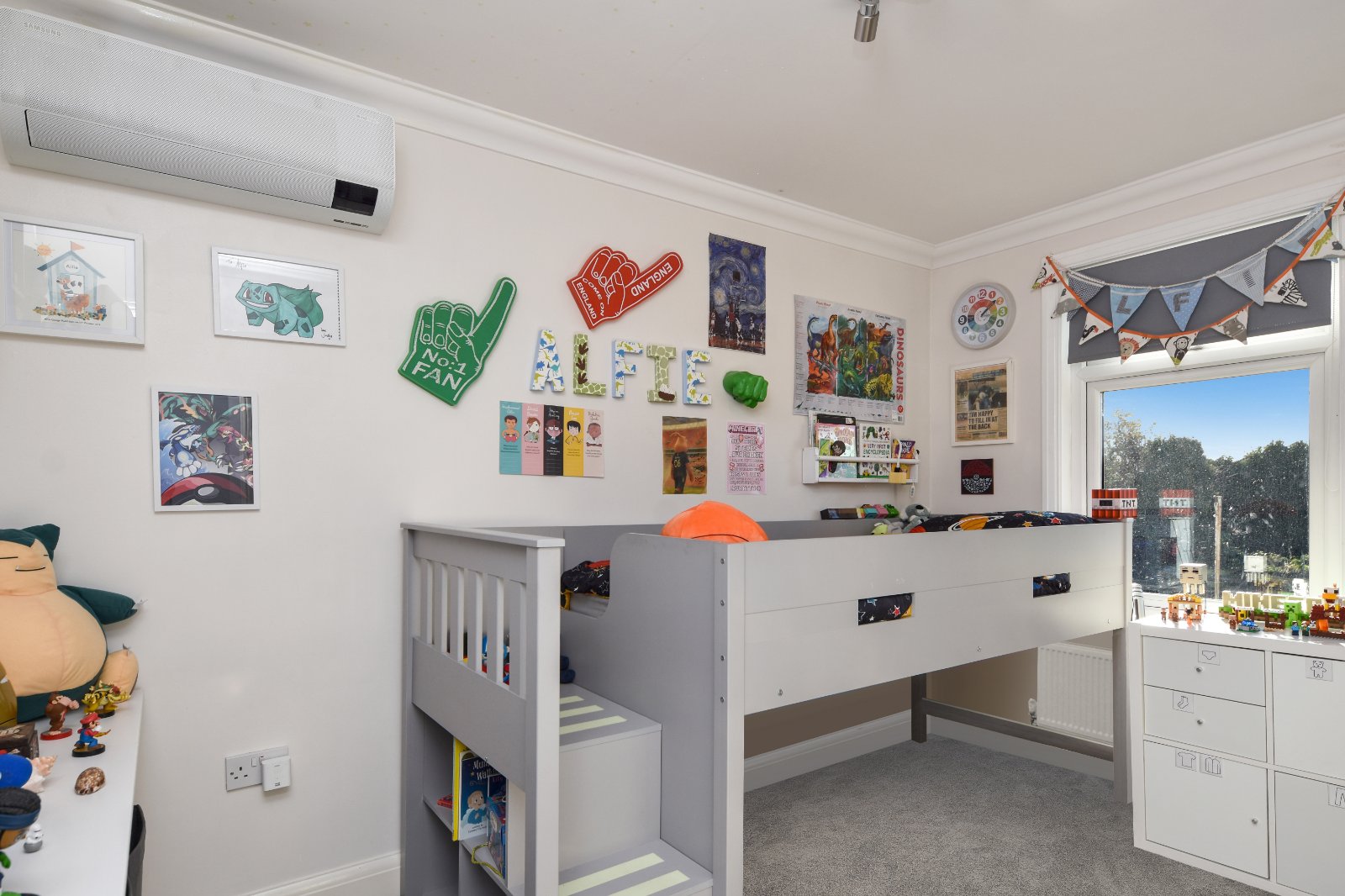 Double glazed window to rear aspect. Radiator. Panelled door to good size recessed wardrobe providing hanging space. Wall mounted air-conditioning unit. Coving to smooth plastered ceiling. Further door to;