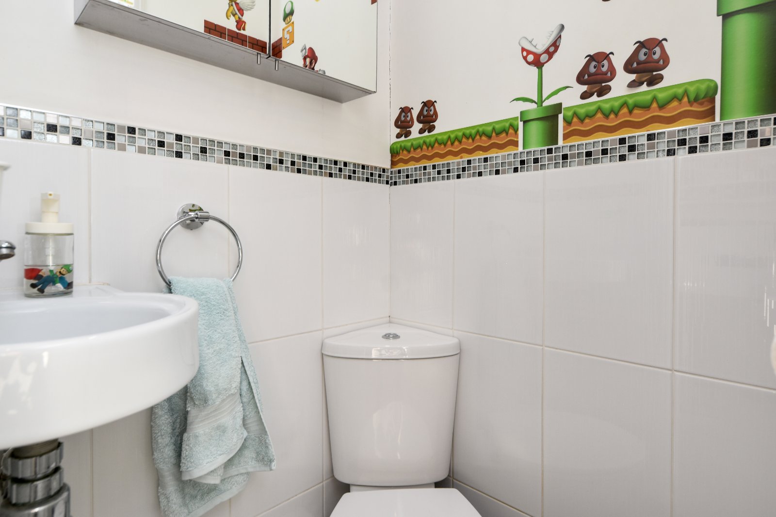 This compact cloakroom features a modern white suite, including a close-coupled corner toilet and a contemporary wall-mounted basin with mixer taps over. Mirror fronted wall mounted cabinet. Partly tiled walls with a decorative mosaic border tile inlay. Smooth plastered ceiling inset with recessed lighting.