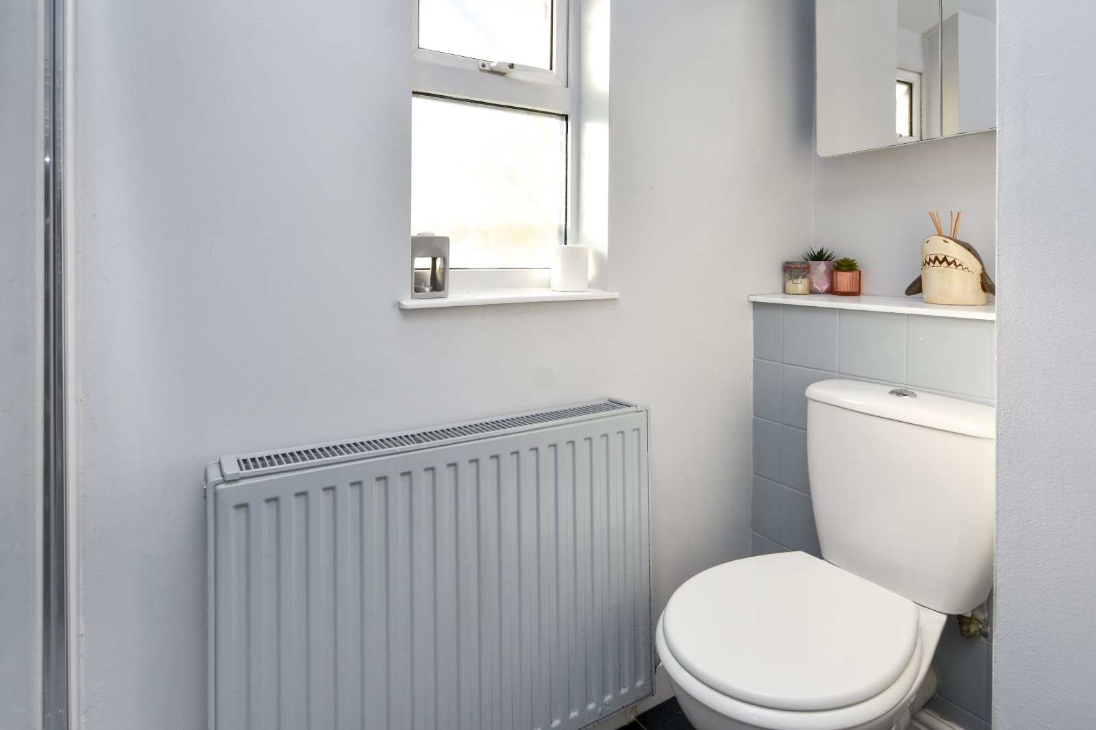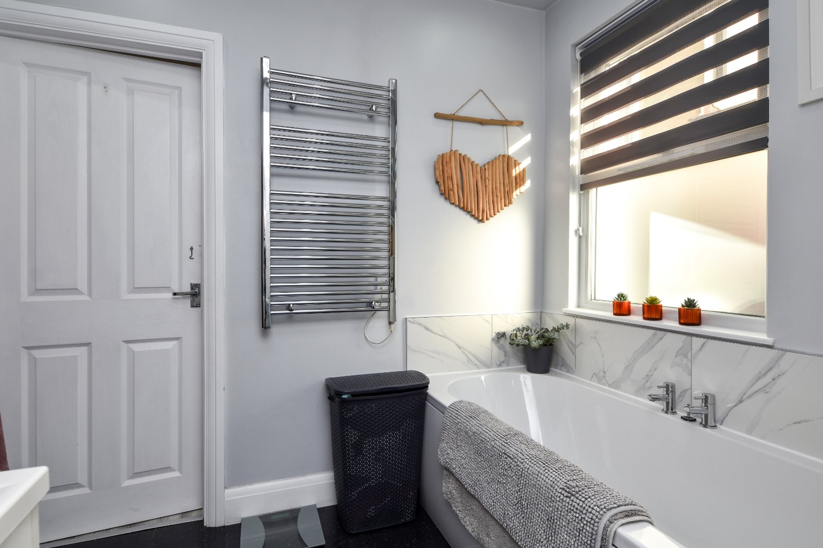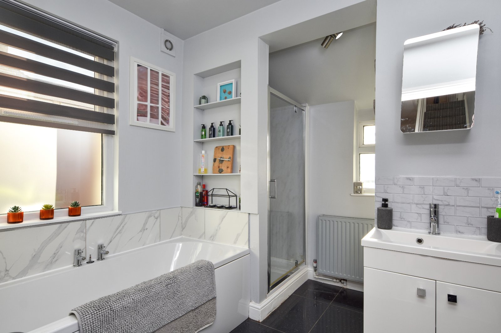 'Part' obscure uPVC double-glazed windows to the side with further obscure uPVC double glazed to rear aspect. A beautifully presented four-piece family bathroom fitted with a modern white suite comprising a panelled enclosed bath with marble-effect tiled surrounds and central control taps, separate shower enclosure with shower boarding to walls with glazed door, integrated shower unit with handheld attachment and drencher-style overhead shower, vanity wash hand basin with mixer tap and storage cupboards beneath and dual-flush low-level WC. Finished with a chrome heated towel rail, tiled splashback detail, recessed shelving niche, laminate tile-effect flooring, wall mounted extractor and smooth plastered ceiling inset with recessed lighting.