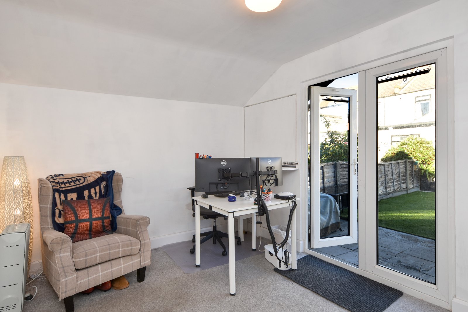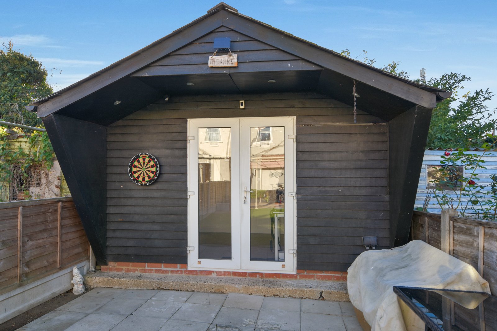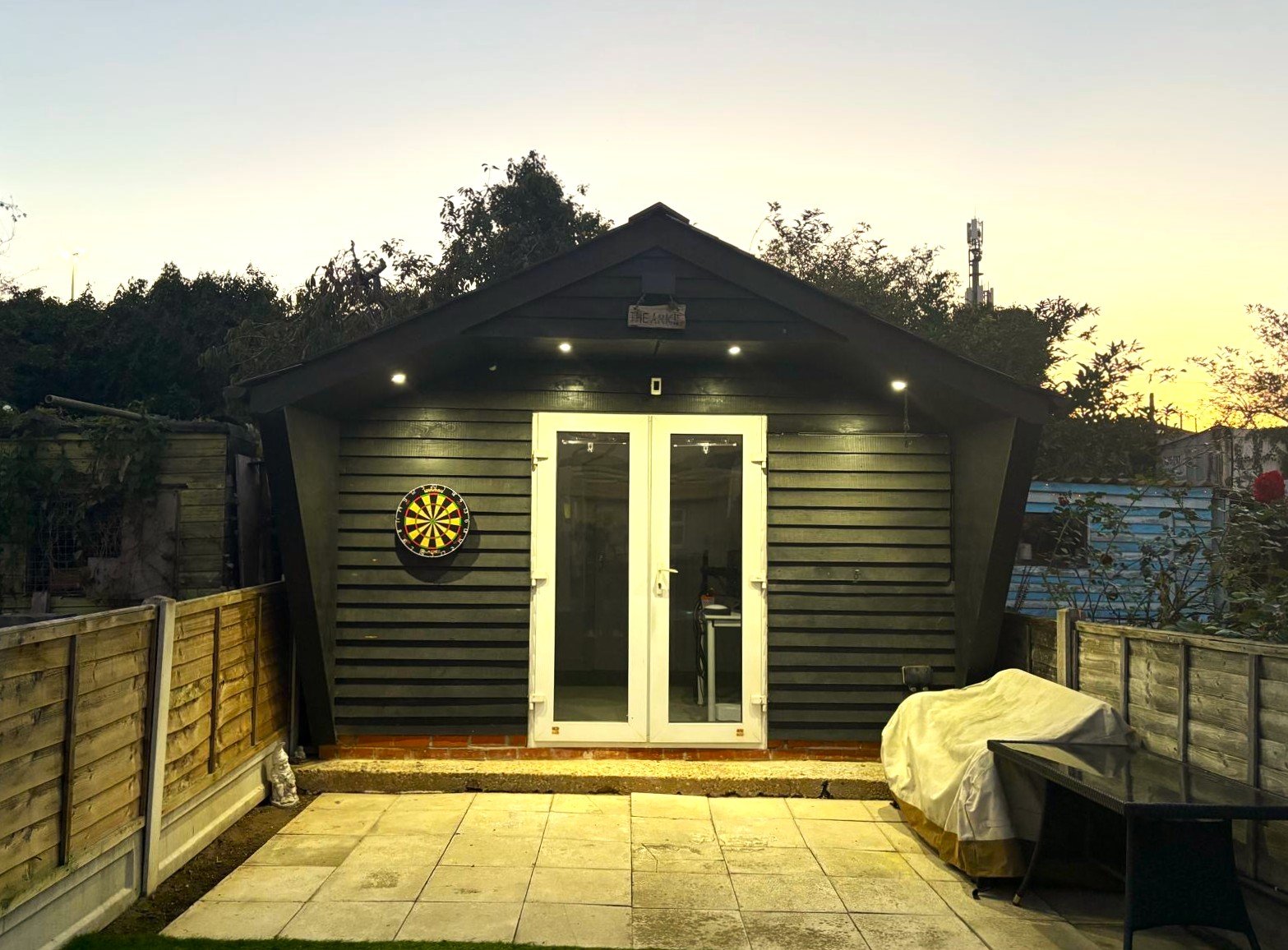Located to the rear of the garden is a superb outbuilding, accessed via a pair of uPVC double-glazed French doors. This versatile and well-presented space is ideal for use as a home office, gym, or studio. To the front, there is also a convenient pull-down hatch, offering the potential for bar use / serving area—perfect for entertaining.