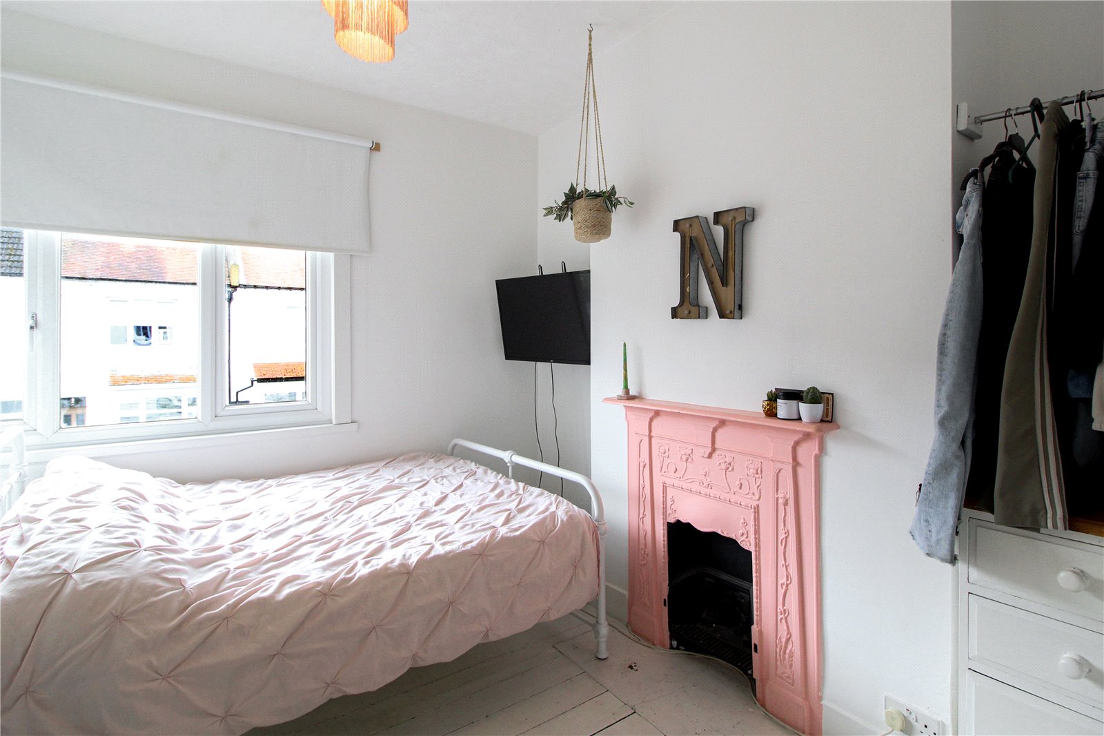 Double bedroom with carpeted flooring. Smooth walls and ceiling with ceiling light. Original fireplace, radiator to front and double-glazed window to rear aspect.