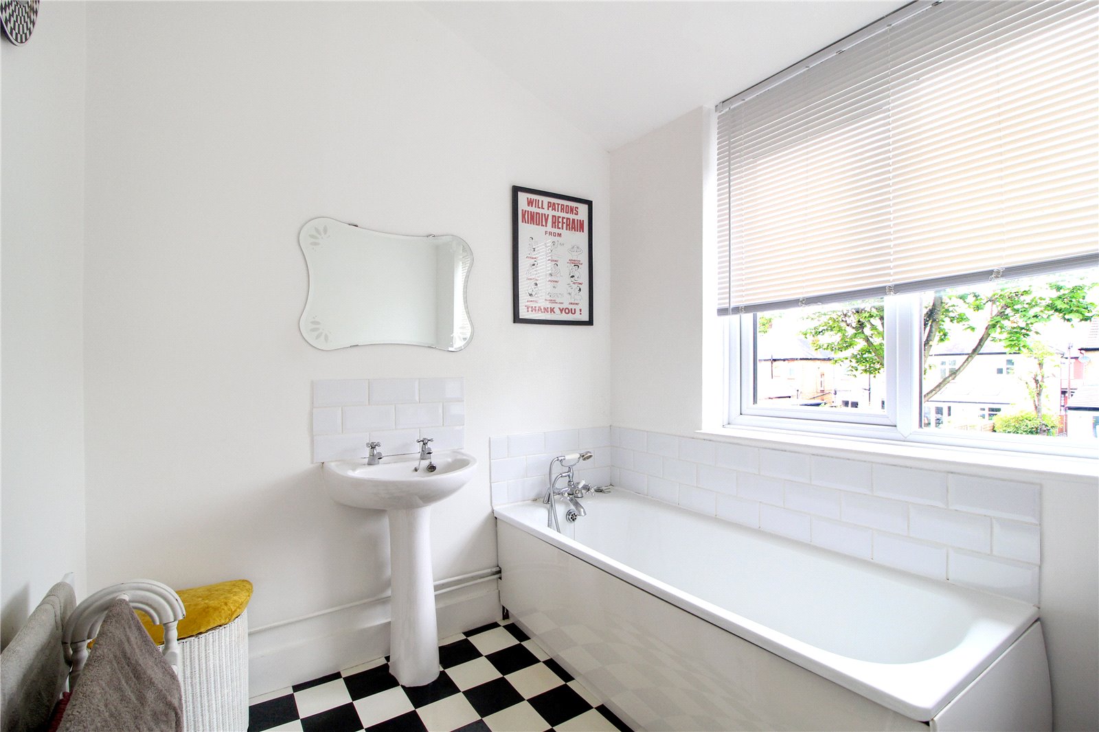 Two-piece bathroom with fitted sink and bathtub. Towel rail and radiator to front with double glazed window to rear. Tiled flooring, with smooth walls and ceiling