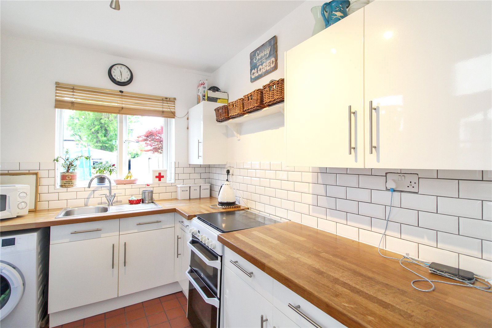 Eye and base level units and tiled backsplash with laminate work tops and space for white goods. Double glazed window to rear aspect and side door leading into the garden.
